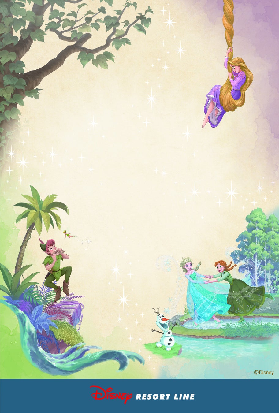 ディズニーリゾートラインの4つの駅をめぐり、全部で7種類のスタンプを押すと、東京ディズニーシーの新テーマポート「ファンタジースプリングス」の世界観をイメージした絵が完成します。