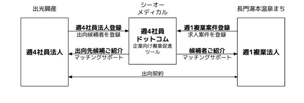 今回のプログラム導入は、山口県長門湯本温泉まち株式会社で10月から本格的に開始されます。プログラム参加社員は、これまで通り週4日は出光興産で勤務しながら、週1日は長門湯本温泉の活性化に向けた企画支援等の業務に取り組みます。週1日分の時間の使い方については、1週間のうち1日を充てるやり方もありますが、週4日×2時間(計8時間)というように何日かに分けて1日分を充てる等、週4社員法人(出光興産)と週1複業法人(長門湯本温泉まち株式会社)の間で自由に設計することが可能になっております。