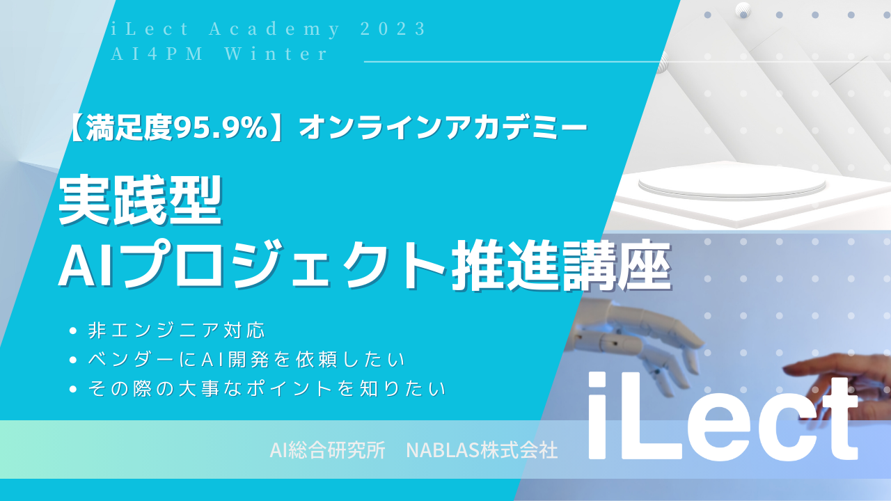実課題の解決を目的としたAI人材育成サービスを提供する「NABLAS」(本社 : 東京都文京区本郷、代表取締役 社長 : 中山 浩太郎、以下「当社」) は、複数企業参加型ビデオ講座「AI4PM 実践型AIプロジェクト推進講座 iLect Academy 2023 AI4PM Winter」の開催が決定しました。