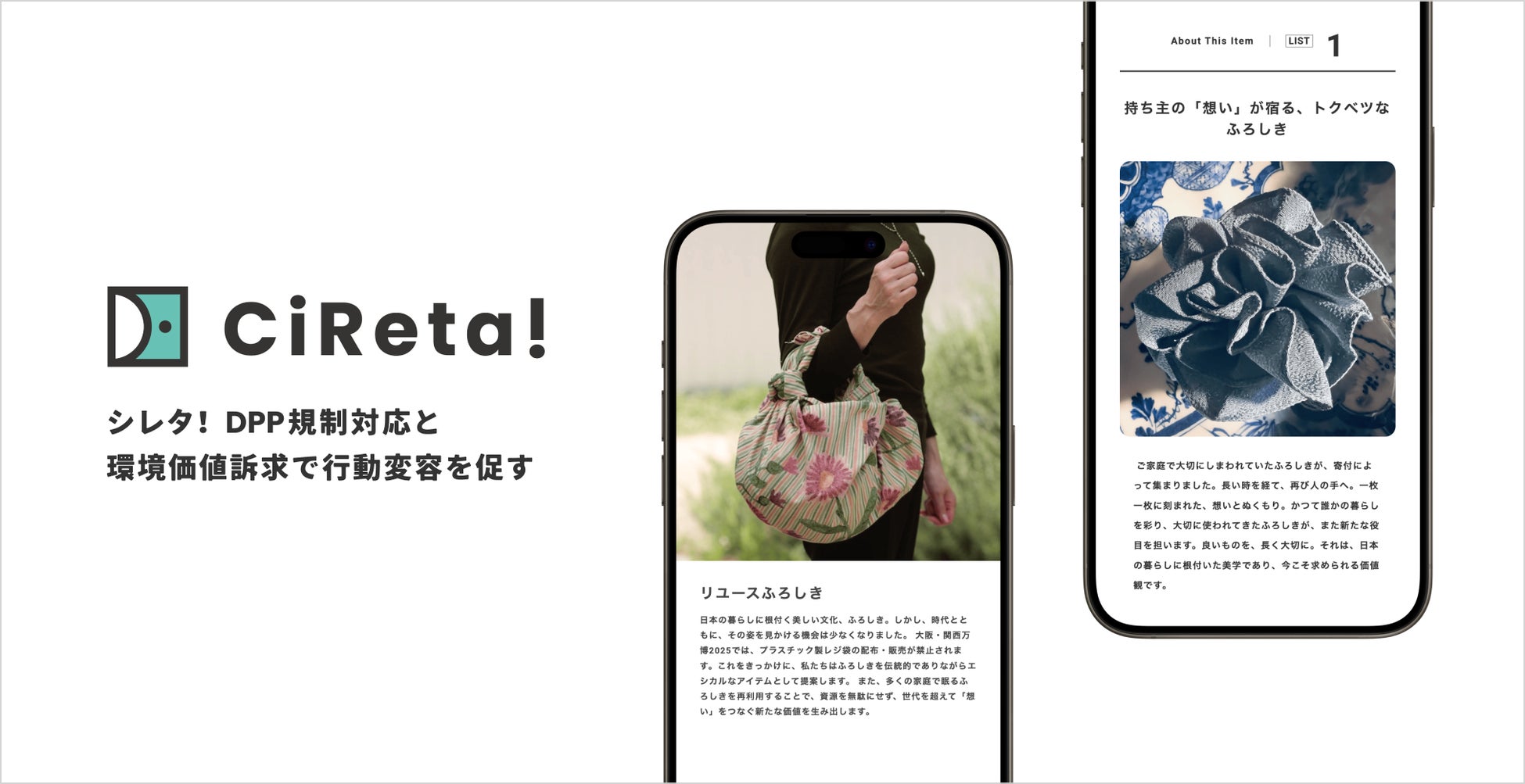 CiReta!はデジタル・プロダクト・パスポート(DPP)対応のプラットフォームであり、各ふろしきに固有のIDを付与して、その来歴やこれまでの所有者からのメッセージなどをデータベースに記録します。