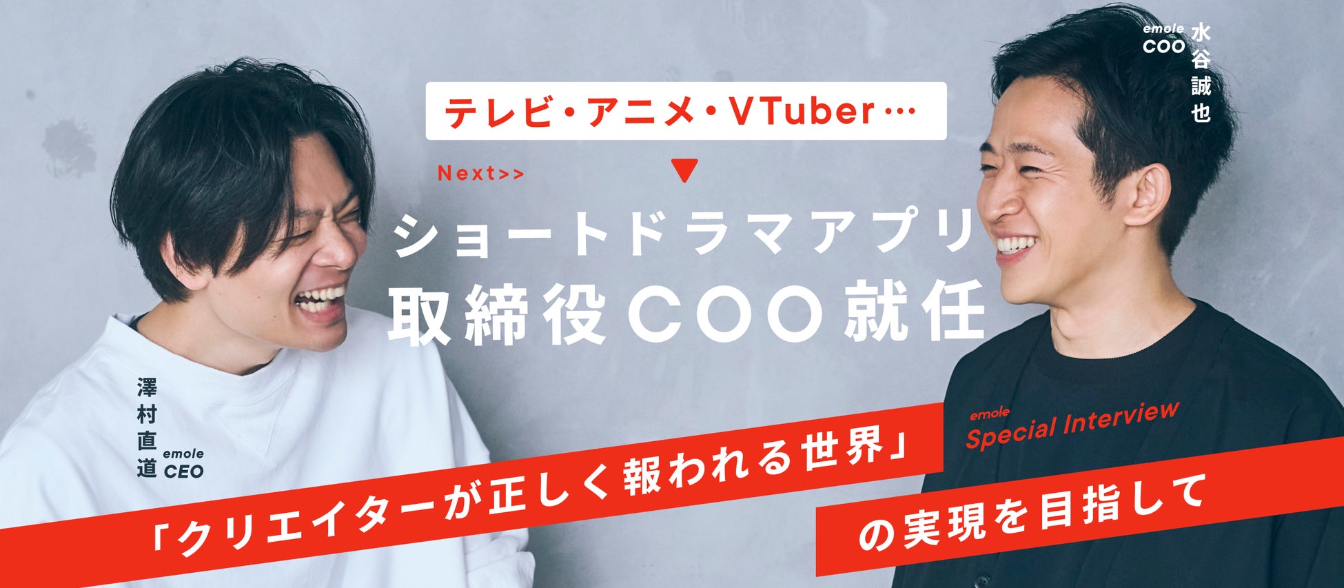 1話3分のショートドラマアプリ「BUMP」の開発・提供を行うemole株式会社(本社:東京都目黒区、代表取締役:澤村直道、以下、emole)は、2024年2月に執行役員として入社した水谷誠也を、取締役COO(Chief Operating Officer)に任命しました。テレビ局でのコンテンツ製作やインターネットテレビ内の「アニメチャンネル」の立ち上げ、VTuber事務所・ライブ配信事業の立ち上げからグロースまでの経験をもとに、主に事業開発やアライアンスの強化、収益分配やリーガル面の強化、コーポレート領域で組織構築全般を担当し、ショートドラマアプリ「BUMP」の飛躍的な成長に向けて経営体制を強化します。