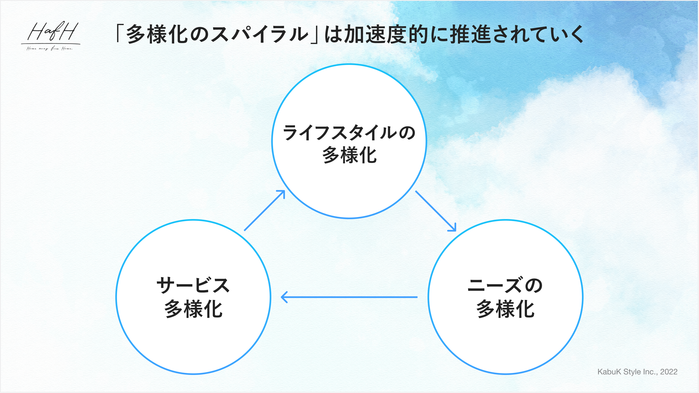 これらの選択肢の多様化は、ライフスタイルの多様化を可能としました。ライフスタイルの多様化は、顧客属性の多様化を意味し、多様化した顧客ニーズに対応すべく、サービスも多様化が進んでいます。デジタル化の進展による細やかな顧客ニーズの把握も、これを後押ししています。また、サービスの多様化は、さらなるライフスタイルの多様化を促進し、この「多様化のスパイラル」は加速度的に推し進められていくと考えられます。