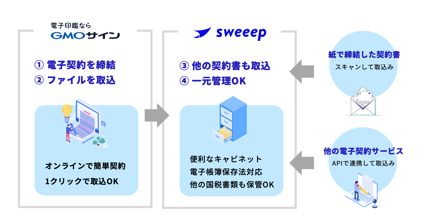 「テクノロジーで働くを楽しく」をビジョンに掲げるsweeep株式会社(本社:東京都渋谷区、代表取締役:村山毅、以下当社)は、AIであらゆるビジネス文書を電子帳簿保存法に対応して保管ができる 「sweeep Box(読み:スイープボックス)」とGMOグローバルサイン・ホールディングス株式会社(本社:東京都渋谷区、代表取締役社長:青山満)が開発・提供する電子契約サービス「電子印鑑GMOサイン」との連携を開始しましたので、お知らせします。