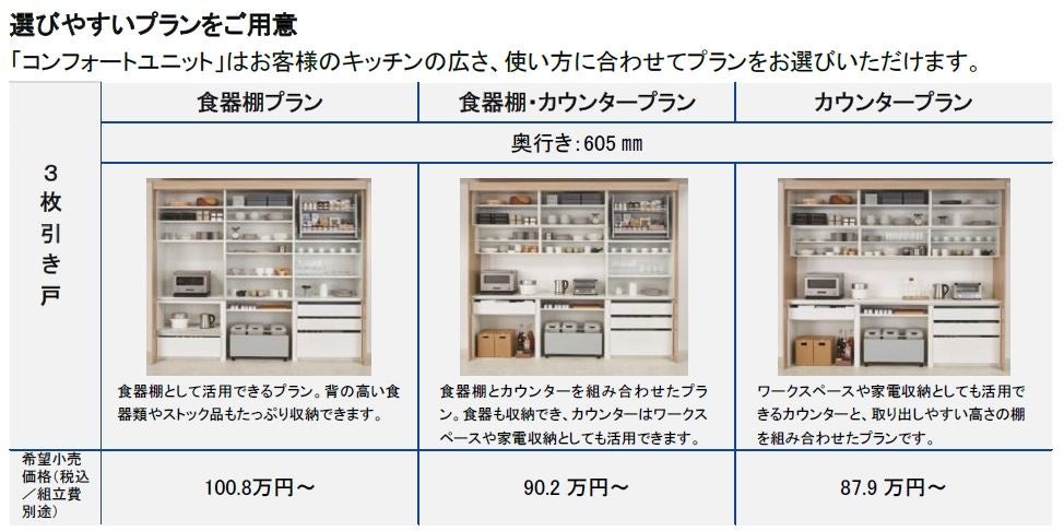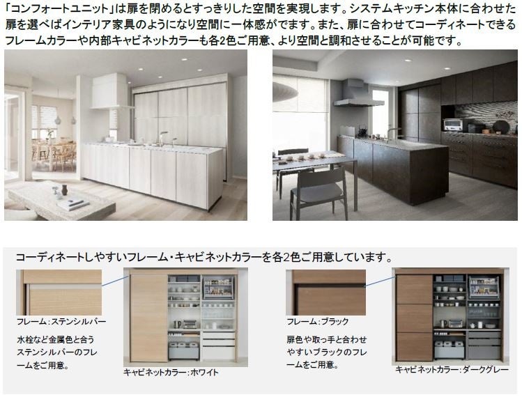 新しい生活様式によりおうち時間が増加し、住まいへの関心が高まっており、キッチンには快適で美しくインテリア性の高さが求められています。今回はLDK空間にもインテリアのように調和する新柄2色「カラカッタカロレ」「白凪(しらなぎ)」を「クリスタルカウンター」にラインアップします。「カラカッタカロレ」は柔らかく浮かび上がる大理石調の柄で高級感のある空間を演出します。「白凪(しらなぎ)」は柔らかな質感の中に、静かに光る水面を模した柄でさまざまな空間と調和します。新柄2色を追加して柄入り計5色、単色計5色のトータル10色が「クリスタルカウンター」に品揃えされ、選択の幅が広がります。コンフォート ユニットは、食器や家電、ごみ箱などキッチンまわりの物を収納できる大容量のキャビネットで、収納だけではなく使い勝手も考え、作業効率を上げるカウンター付きの新しいプランをラインアップします。キッチン本体と同じデザインの扉を選ぶことができ、扉を閉めると家具のようなしつらえで空間をすっきり見せます。