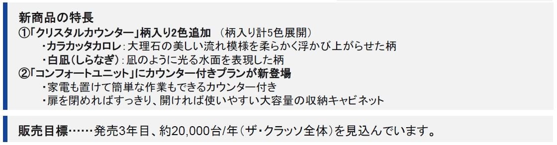 2020年フルモデルチェンジした「ザ・クラッソ」は“美しい、使いやすい、きれい”をコンセプトにデザインと テクノロジーが融合したアイテムを搭載し、ご好評いただいています。今回は、ご購入されたお客様の94%※1の方にご満足いただいている「ザ・クラッソ」の人気アイテムで、TOTO独自開発の「クリスタルカウンター」に新柄2色を追加、さらに周辺ユニットには効率的に作業ができるカウンター付きの「コンフォートユニット」を新たに品揃えします。