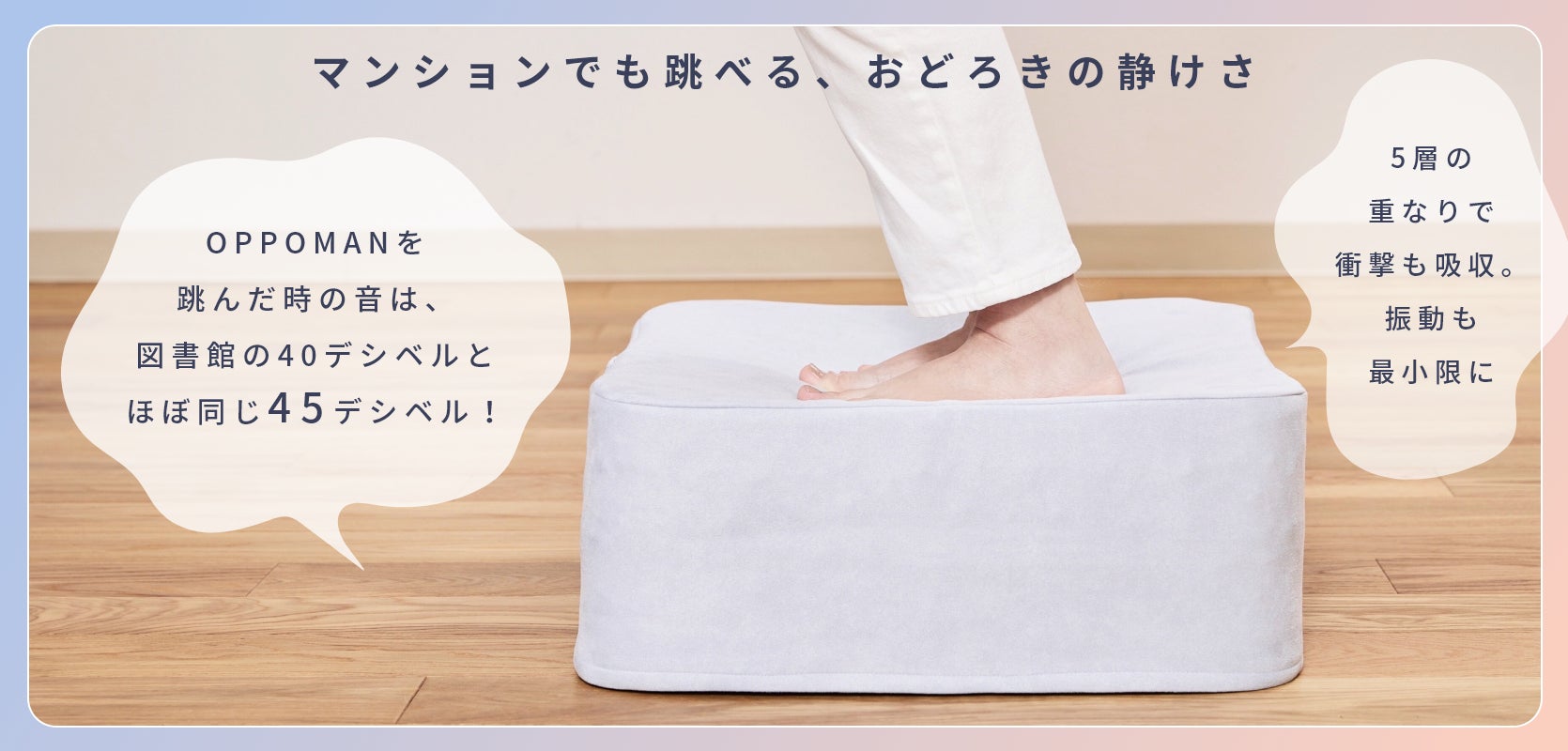 トランポリンの素材は、3,003通りもの素材と組み合わせから厳選されたファイバークッションを使用。また、3次元ファイバー、高弾性ウレタンフォームを高反発ウレタンチップで挟み、5層に重ねたサンドイッチ構造でしっかり衝撃も吸収。振動の心配もありません。さらに、OPPOMANを跳んだ時のデシベル数は、図書館内とほとんど同じ45デシベルとなっており、夜の時間帯の運動やマンションでも騒音を気にせず安心してご利用いただけます。