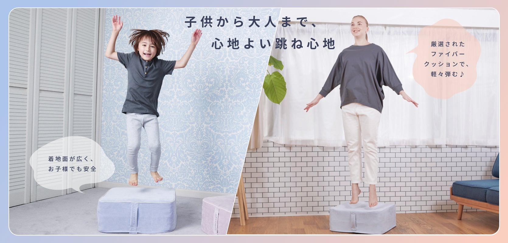 他社のトランポリンよりも縦横それぞれ10cm幅広の、50cm×50cmと広めの面積で作成しているため、着地面が広く、お子様が遊んで跳ねる際にも安心してお使いいただけます。また、厳選されたファイバークッションが衝撃をしっかり吸収するため、大人の方も着地の際足腰に負担がかかる心配はありません。