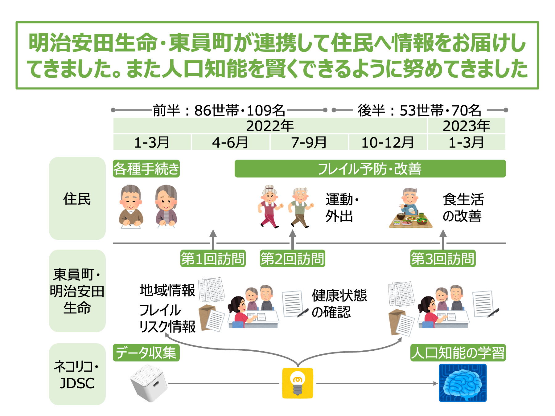 実証実験には65歳以上の高齢者86世帯、109名が参加。フレイルリスクの高い方と後期高齢者は東員町(地域包括支援センターおよび民生委員)、それ以外の前期高齢者は明治安田生命が、2022年5月から2023年2月の間で計3回訪問活動を行いました。訪問活動では、電力データからAIが分析した自身のフレイルリスク変化に関する情報、フレイル予防に関する一般的な情報、東員町の行政サービス案内(通いの場や介護予防活動の情報など)を届けました。