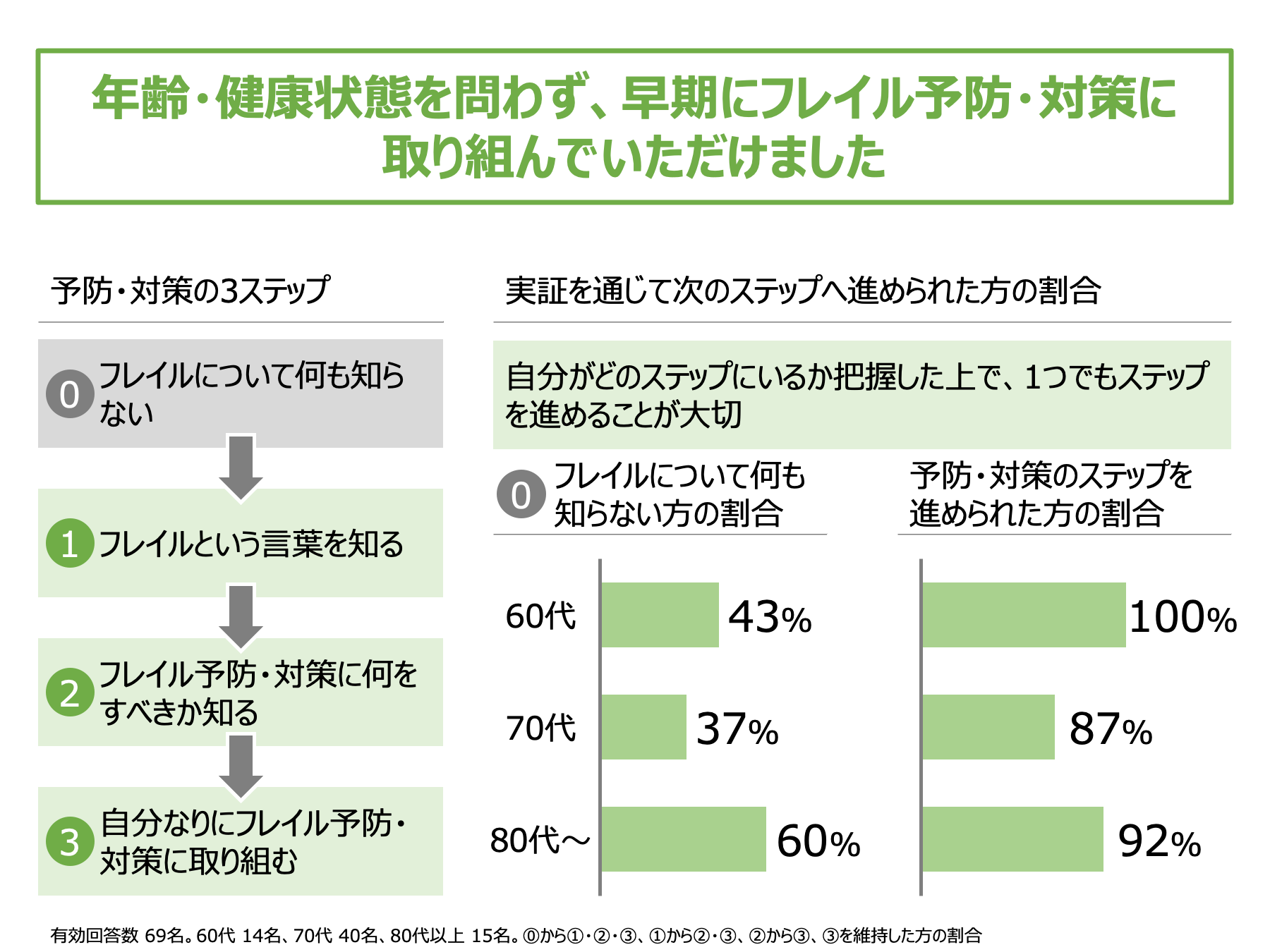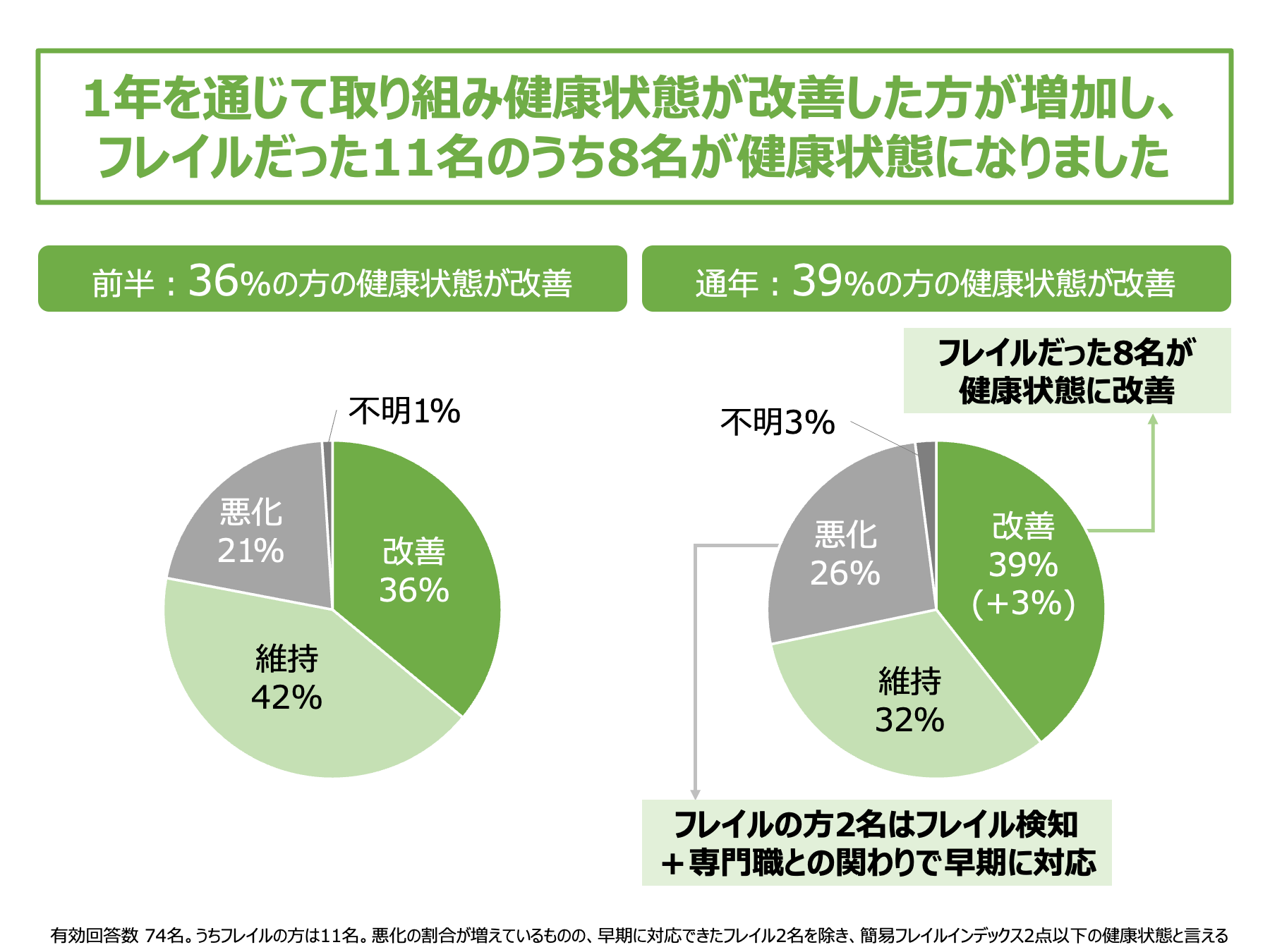 実証開始時は、年齢が若い層ではフレイルの認知度が約4割と低い状態でしたが、今回の訪問活動により全ての年齢層で約9割まで向上し、そのうち約7割の方が運動や食事バランスの改善など、フレイル予防に意識して取り組まれるようになりました。また、訪問活動、情報発信を重ねるほど健康状態が改善する傾向も確認され、実証開始時にフレイルリスクの高かった8名の方が、健康な状態に改善しました。