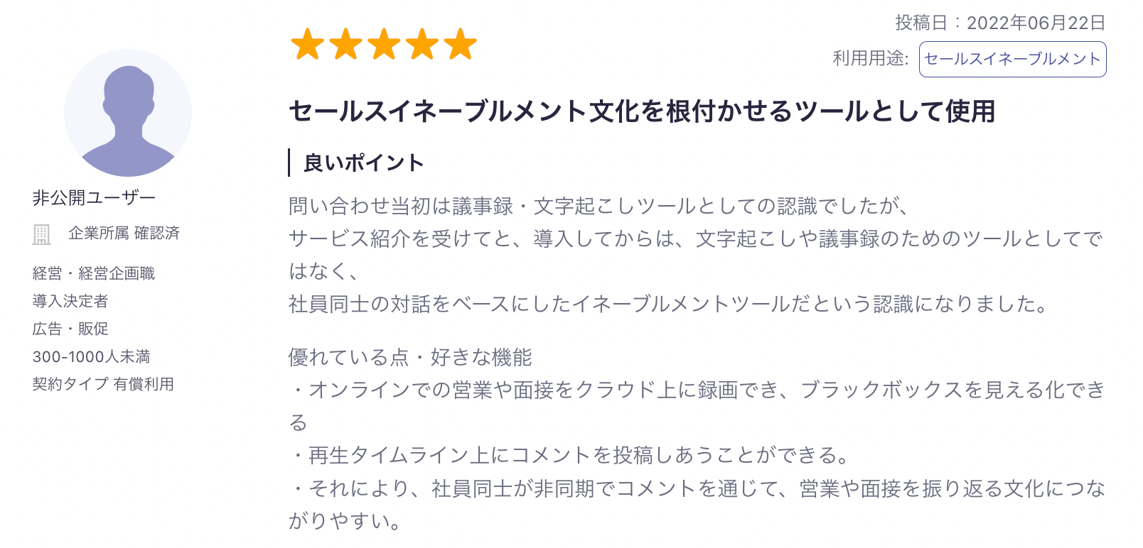 ITreview に投稿いただいたユーザーレビューの一部をご紹介します。「録画データの自動文字起こし機能で議事録作成に利用できるだけでなく、商談を見える化することでメンバー同士での振り返りや研修コンテンツなど営業人材の育成ツールとしても使用できる。」など高評価をいただいております。