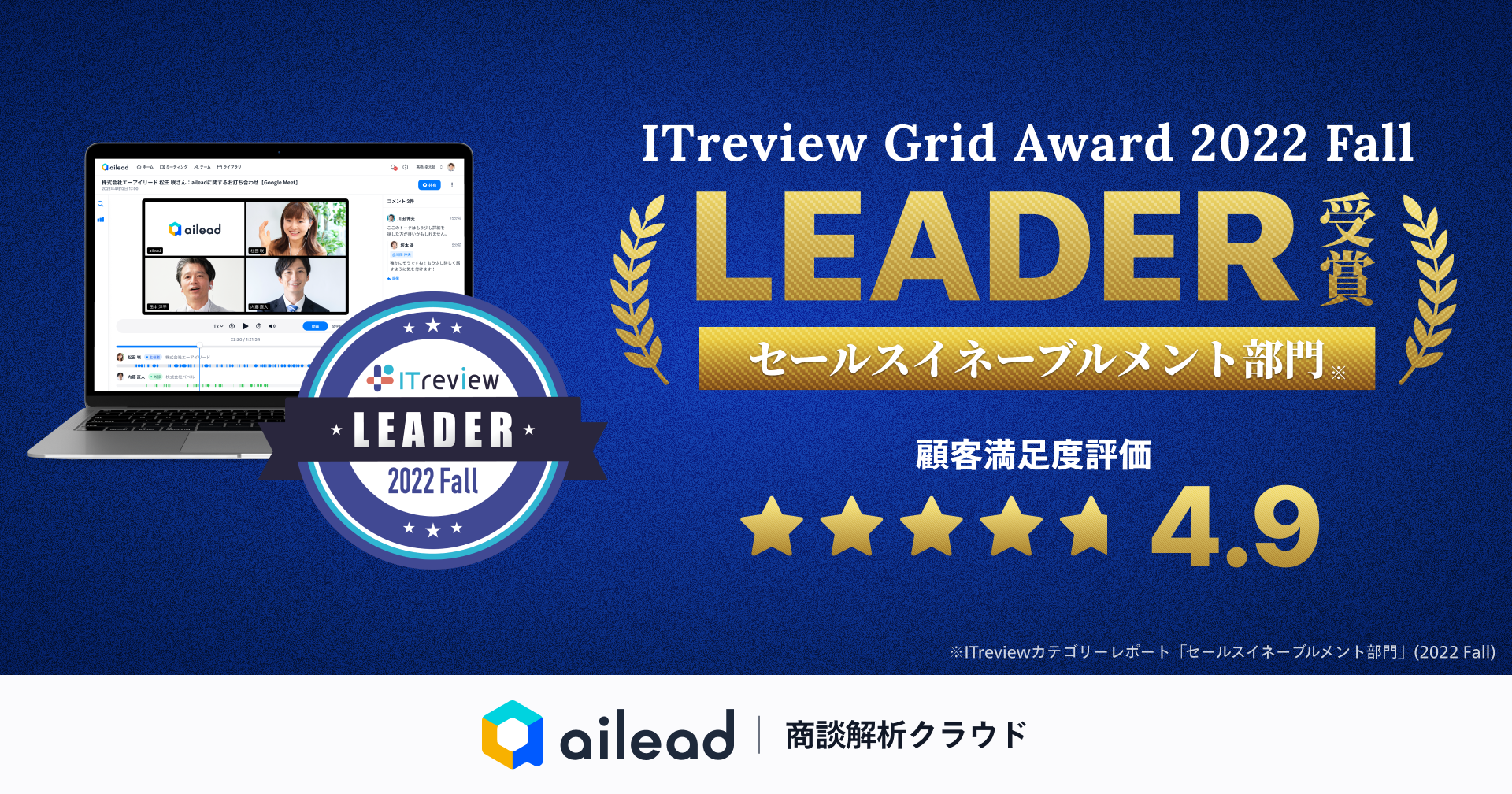 商談解析クラウド 「ailead」 、 ITreview Grid Award 2022 Fall のセールスイネーブルメント部門で「Leader」を受賞