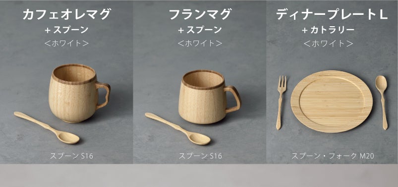 「カフェオレマグ<ホワイト>」と、「スプーンS16<ホワイト>」からなるセットアイテム。
