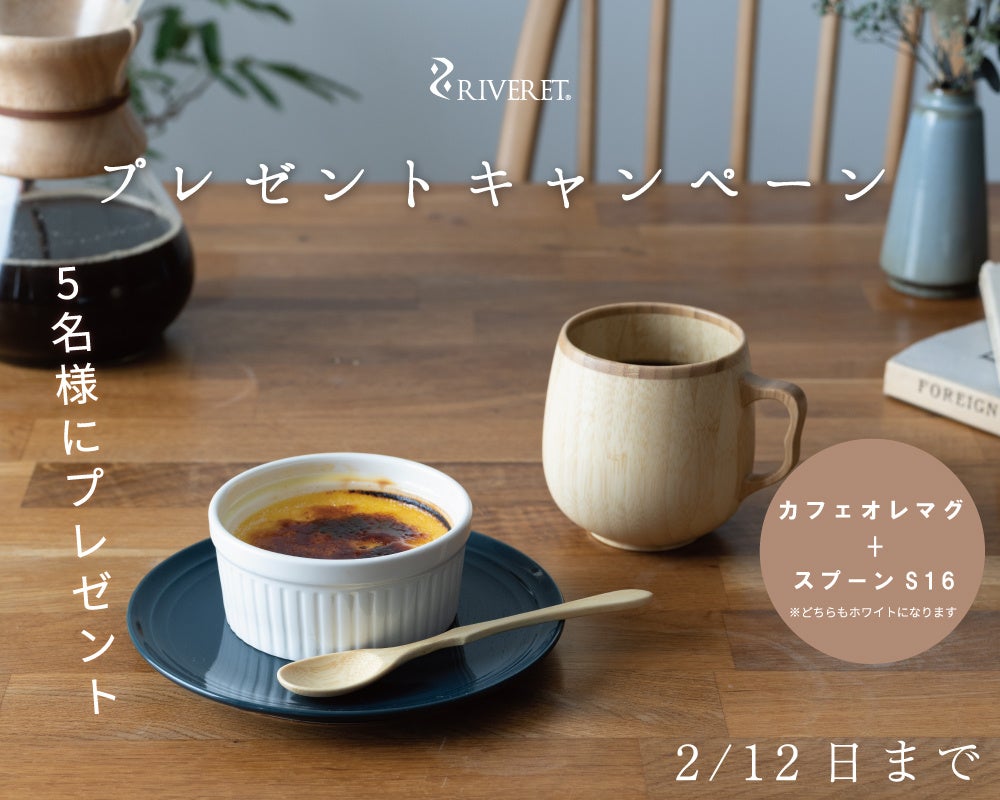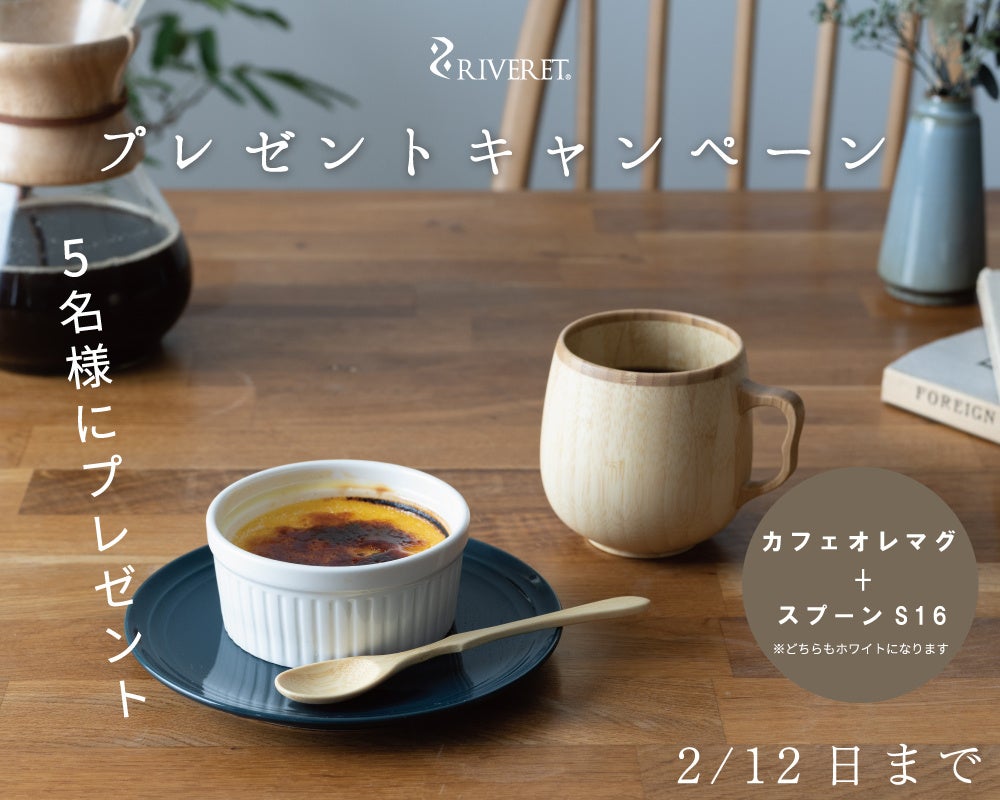 天然素材製品の製造販売を手掛ける仲吉商事株式会社は、オリジナルデザイン食器ブランド「RIVERET(リヴェレット)」https://www.riveret.jp/より、プレゼントキャンペーンを開催しております。2月12日(日)正午までRIVERET公式ブログにてご応募いただいた方5名様に「カフェオレマグ(ホワイト)」「スプーンS16(ホワイト)」をプレゼントいたします。 (キャンペーン応募ページ▶︎https://www.riveret.jp/blog/campaign/campaign202301/)