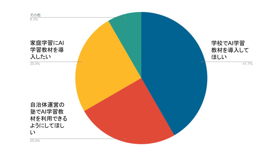 【④】保護者 AIを活用した個別最適な学びに対する希望:「学校でAI学習教材を導入してほしい」が最多であり、次いで「自治体運営の塾でAI学習教材を利用できるようにしてほしい」、「家庭学習にAI学習教材を導入したい」が上げられている