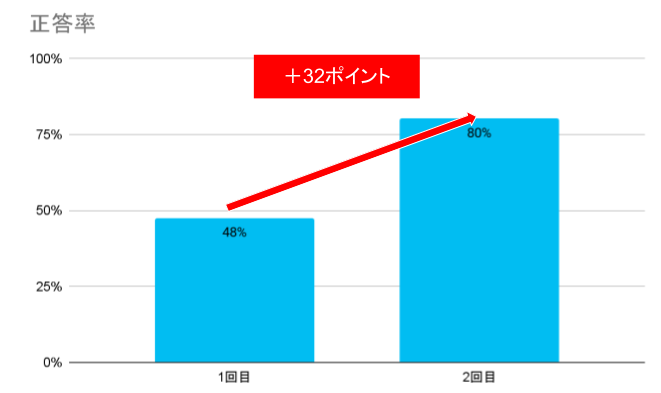 「最も復習したい単元」に関して、一回目のテストと二回目のテストの正答率は48%から80%と32ポイントの上昇が認められた。