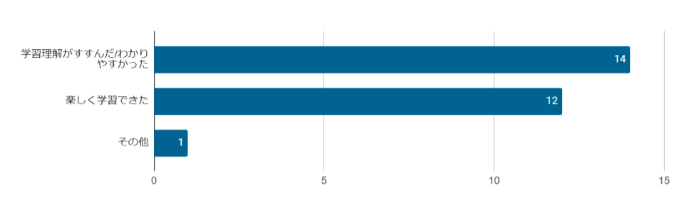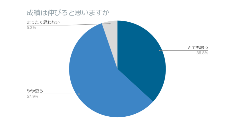 90%以上の生徒が「とても思う」または「やや思う」と回答した。特に、「とても思う」を選択した生徒は、一回目のテストと二回目のテストの正答率が平均して52ポイント上昇しており(全体平均:32ポイント)、理解度の高まりが学習効果の実感に繋がっている。