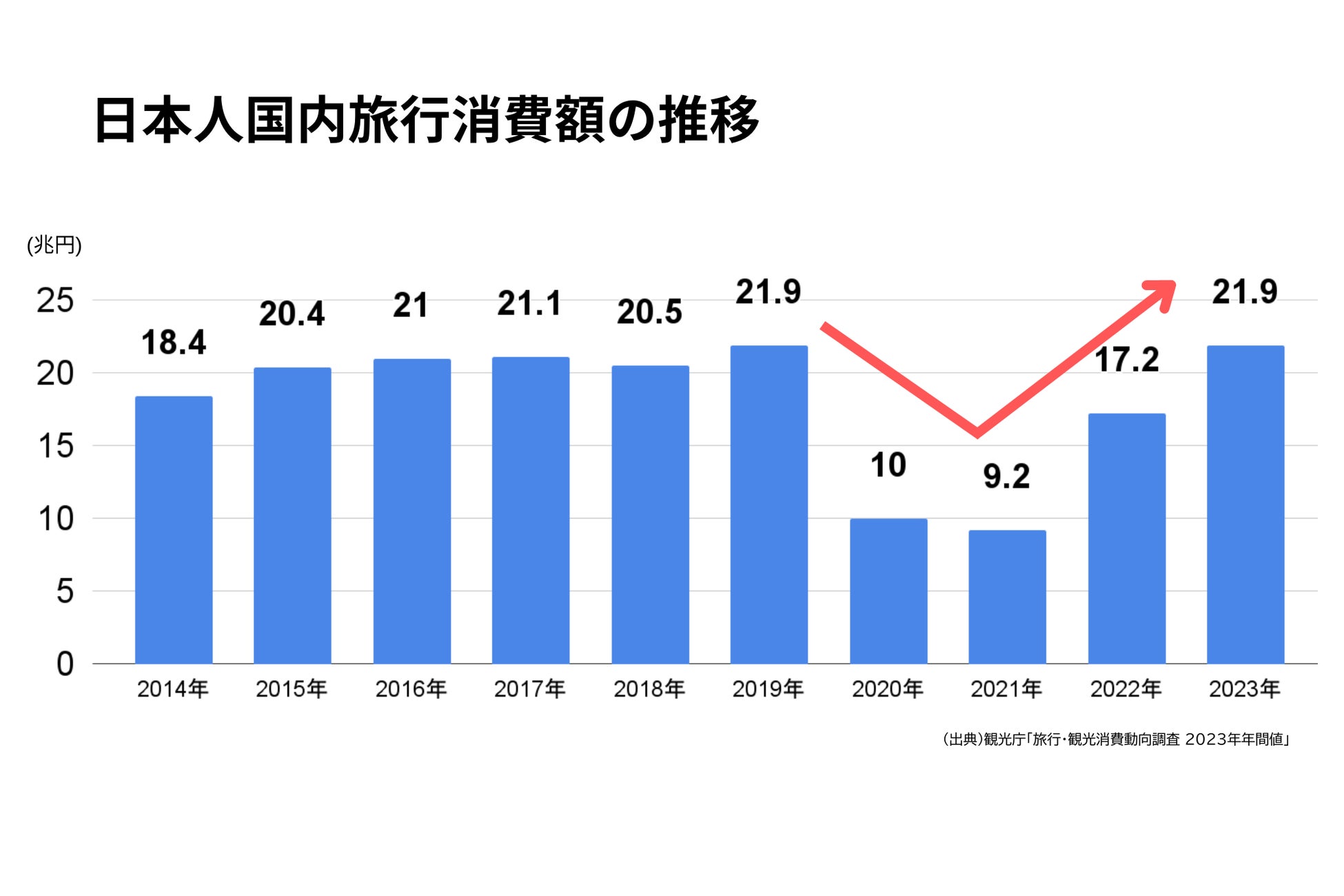 アフターコロナを迎え、国内の旅行需要は大きな揺り戻しを受けています。観光庁の「旅行・観光消費動向調査 2023年(※1)」によると日本人国内旅行消費額は21兆9,101 億円(2019年比0.1%減、前年比27.7%増)であり、国内の旅行需要はコロナ禍以前の水準にほぼ回復しています。