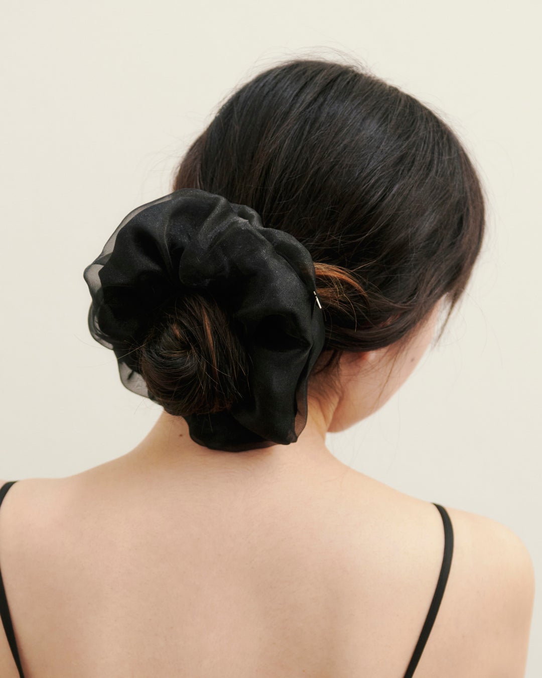 サテンとオーガンジーの二層構造で、ボリュームを強調するシルエットに仕上げたシュシュ。