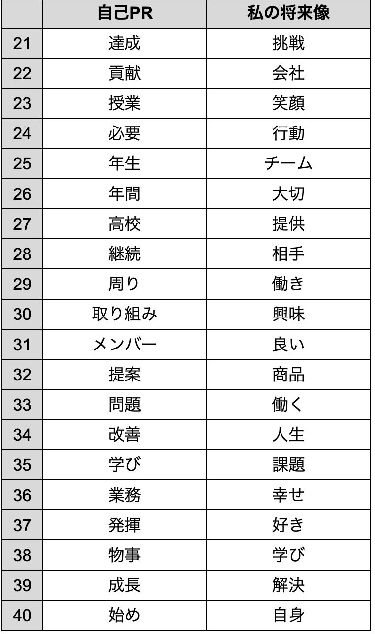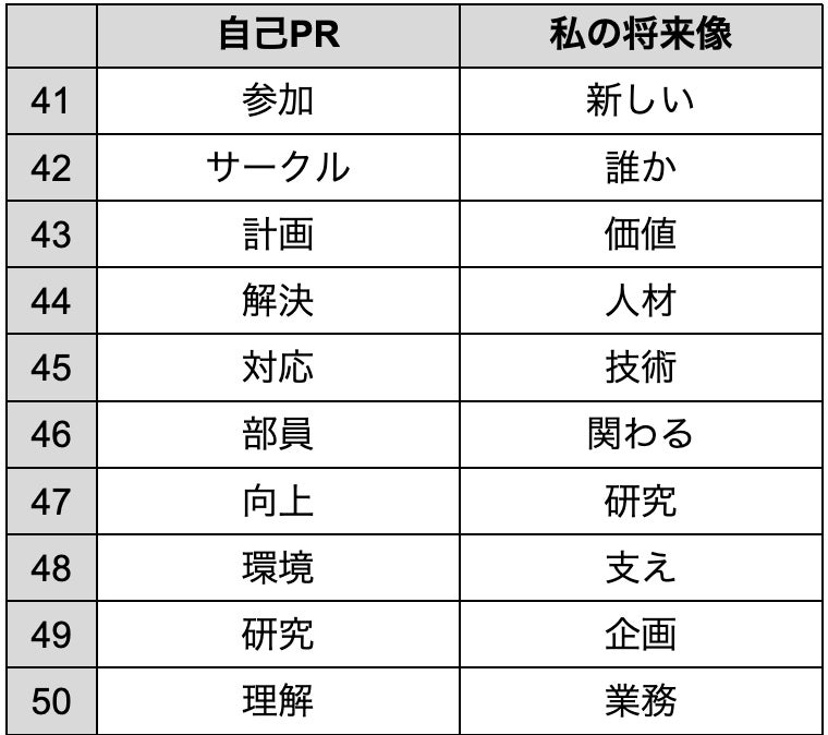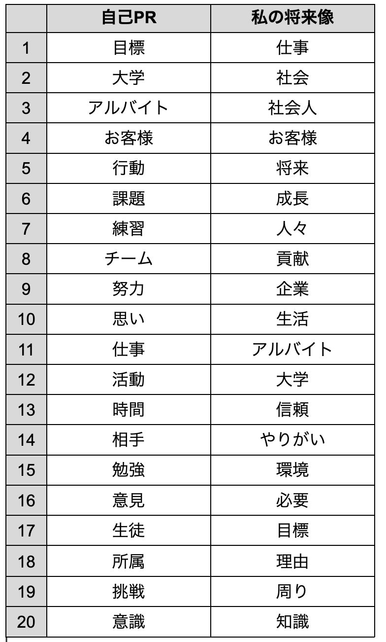 この度は、「自己PR」と「私の将来像」の文章をテキストマイニングし、23卒学生において最も使われる言葉を調査。上位50位をまとめました。