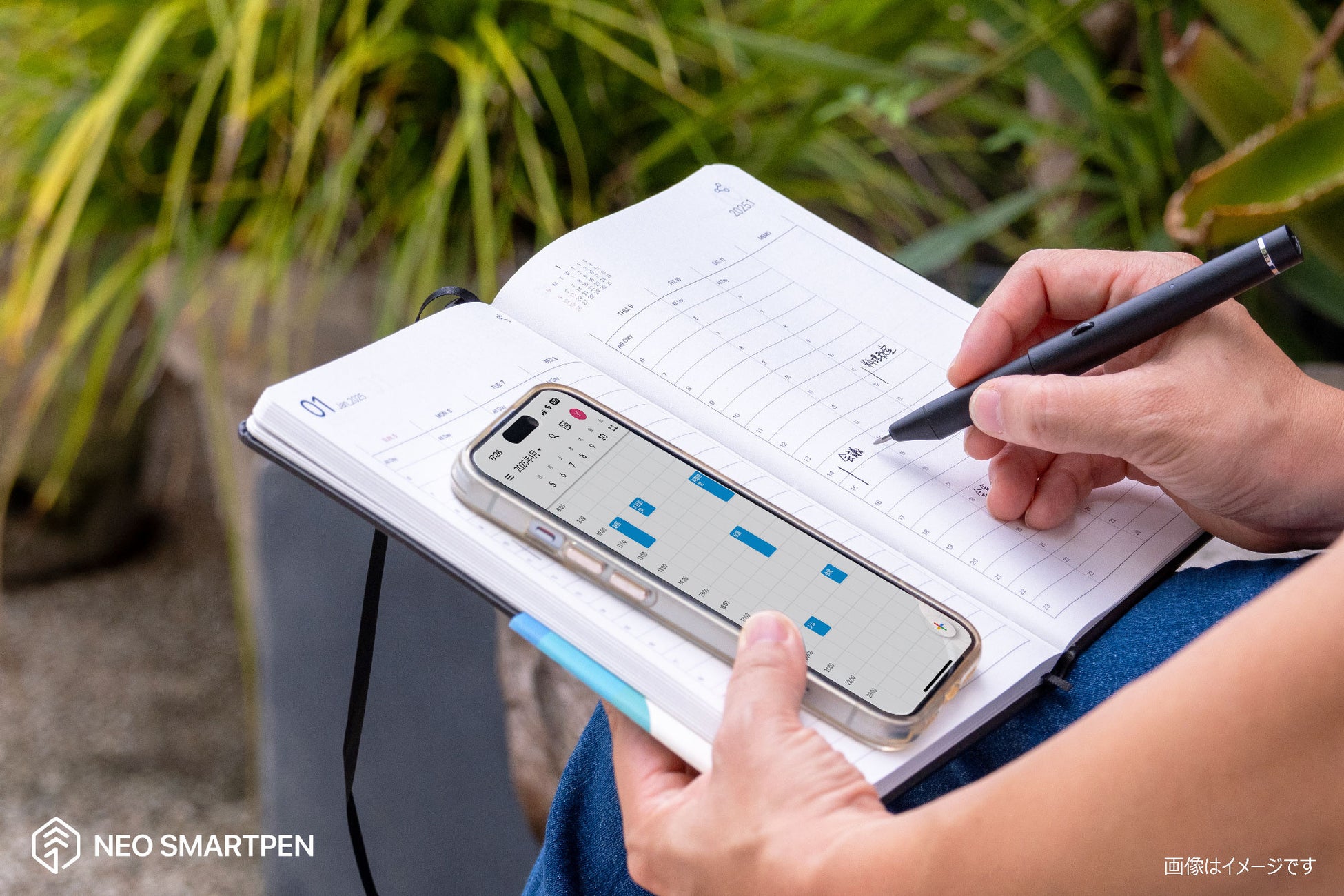 この手帳にNeo smartpenで手書きした予定は、専用アプリ「Neo Studio」によりノーステップで書いたそのままデジタル化。手書きなのに複写されるような使い方ができます。手書きなのに検索もできる驚き、利便性を日常にできる紙の手帳です。
