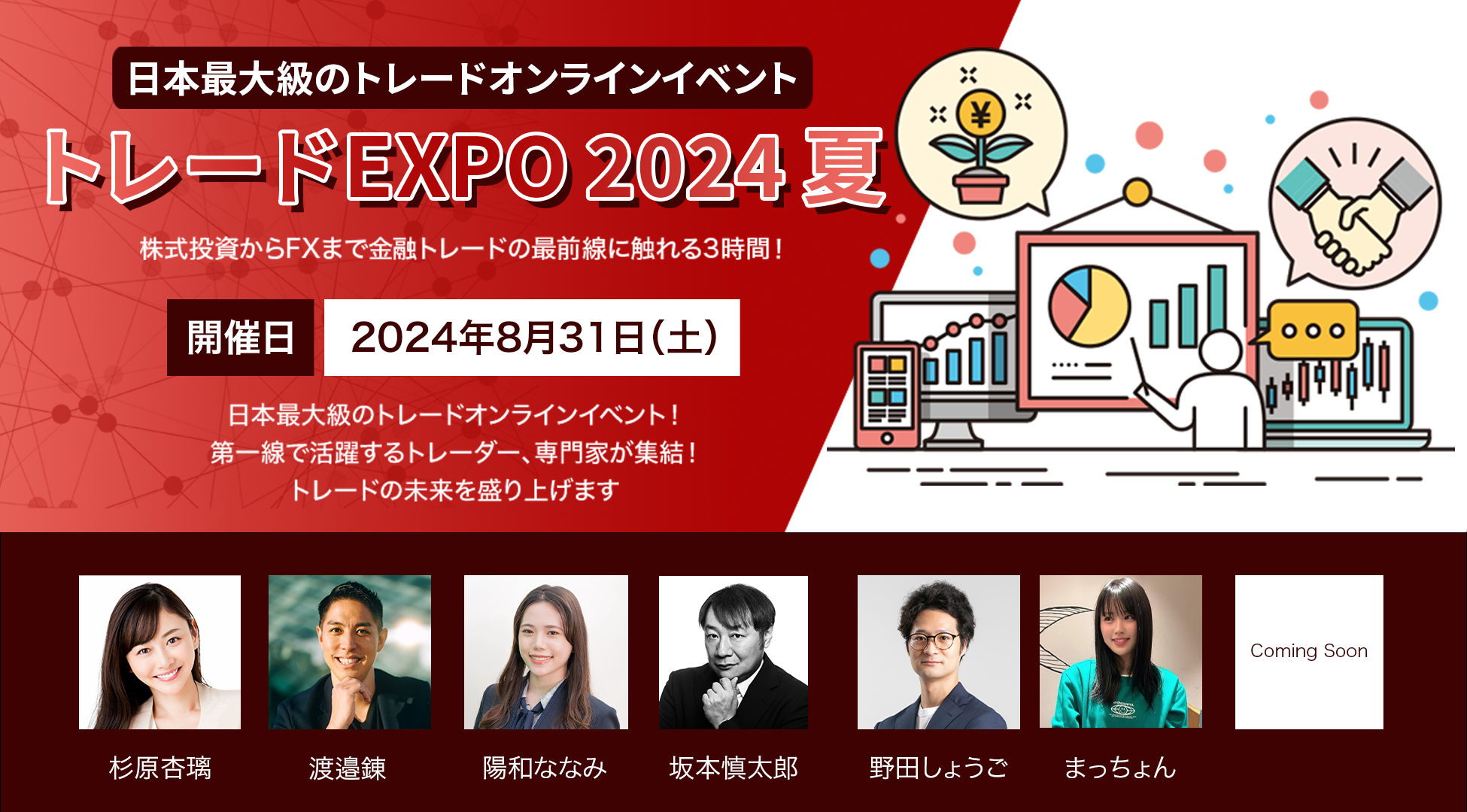 2024年8月31日(土)に開催される「トレードEXPO2024夏」(以下「本イベント」)では、金融のさまざまな分野で活躍するトレーダーや専門家、豪華7名のゲストの方にご出演いただき、業界動向、リテラシー、テクニック、最新知識などを講演やパネルディスカッション形式で学べるオンラインイベントです。本イベントは日本初の副業専門スクール「副業アカデミー」の学長であり副業専門家の小林 昌裕氏が司会を務め、「第一部 資本形成の王道と革新!未来を切り拓く投資の成功法則」「第二部 明日から使えるデイトレード実践講座 」「第三部 FXトレード最前線!2024年の最新トレンドを徹底解説」「 第四部 トレードEXPO特別企画 投資の未来と人生の夢をかなえる方法」の 四部構成でお送りします。また、国内最大級の金融情報メディア「ZUU online」を提供する株式会社ZUU(東証グロース:4387)との共催となります。ZUUからもトップアナリストが登壇!最新のトレード情報を手に入れる絶好の機会をお見逃しなく!