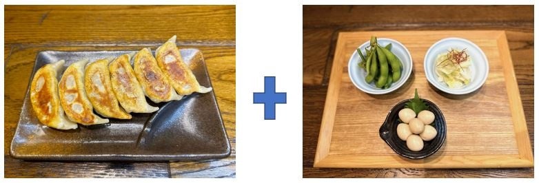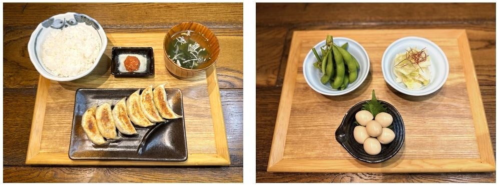 餃子1枚、ご飯、わかめスープ、山椒明太、肴2種(ミニ柚子キャベツ、ミニ枝豆、うずらの味玉からお好きなもの2種お選びください)特典にカード3枚(※無くなり次第終了)が付いてきます。