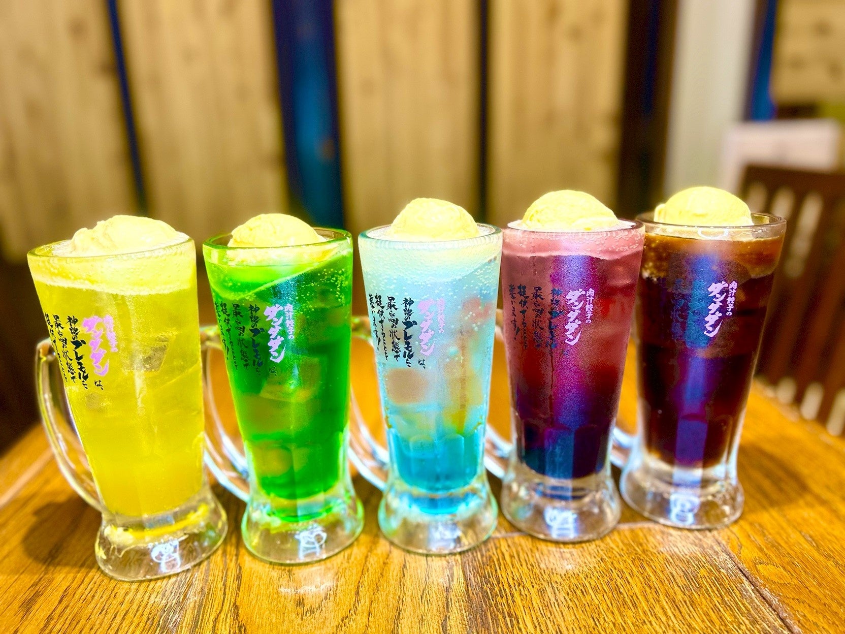 写真左から、蜂楽のパイナップルフロート、潔のメロンフロート、凛のラムネフロート、玲王のグレープフロート、凪のコーラフロート。特典にカード1枚(※無くなり次第終了)が付いてきます。