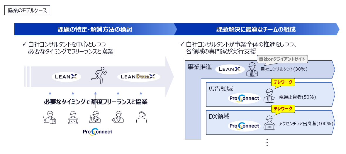 フリーランスコンサルタントと企業のマッチングプラットフォームである「ProConnect」と、自社のコンサルタントとフリーランスの専門性を掛け合わせた新たなDX/AIコンサルティングサービス「LeanX」の2つのサービスシリーズを展開しています。