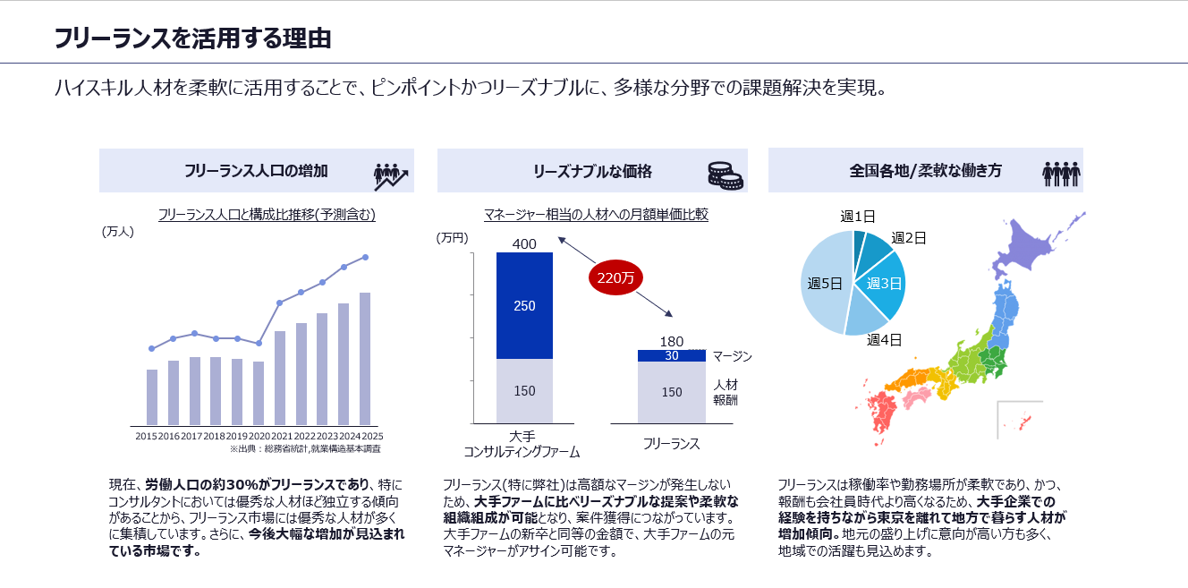 独立しても仕事を獲得できるレベルのハイクラスなコンサルタントの中から、プロジェクトが求める経験をピンポイントで持つ人材を選出でき、さらにファームよりもかなり安く調達できます。一度類似の経験をしている人が対応することで、プロジェクトの進みも速くなります。