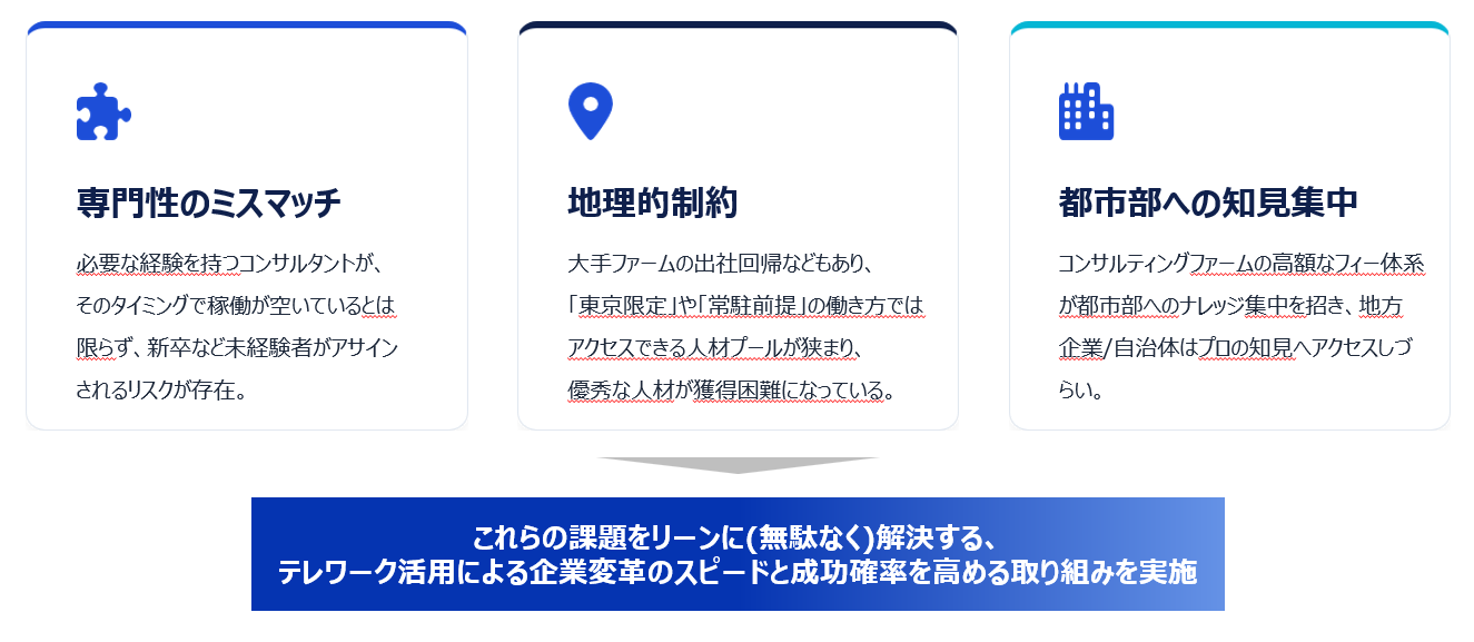 従来のコンサル業界では、社内の空き状況を優先するアサインによるミスマッチや、生活環境の変化による優秀な人材の流出が大きな課題でした。