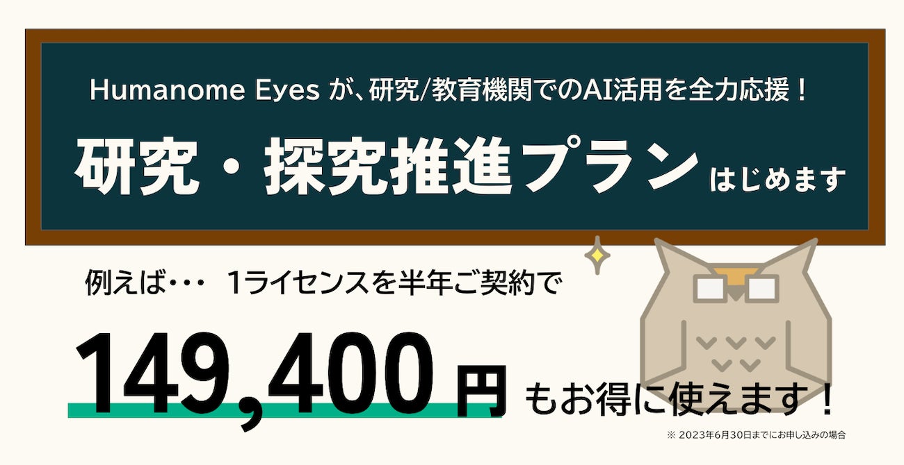 この度、当社は次世代のデジタル人材教育の応援を目的として、アカデミアと研究/教育機関を対象に「Eyes研究・探究推進プラン」を開始いたします。研究・教育へのAI導入障壁を下げるHumanome Eyesの便利さを、この機会にぜひ体感ください。研究・探究に取り組む全ての皆様に新たな発見を促す環境づくりをお手伝いします。