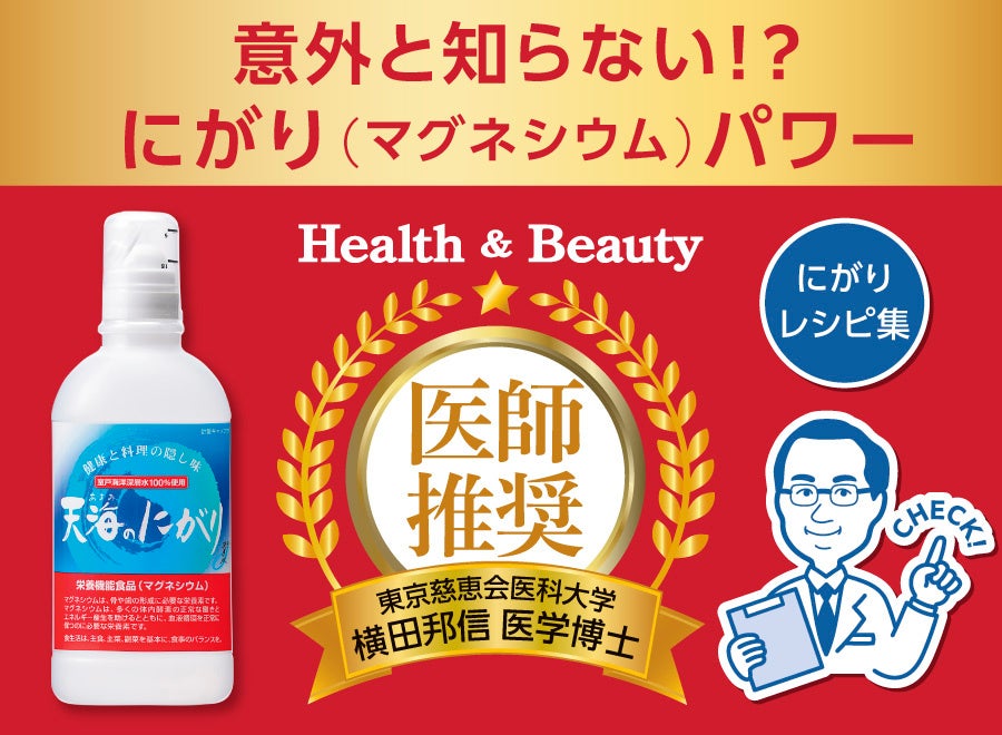 特設ページでは、日本で最もマグネシウムを愛するドクターの一人、東京慈恵会医科大学 横田邦信 医学博士の解説やコメント、健康・美容へのスタッフの声、「天海のにがり」を使った簡単レシピを紹介しています。