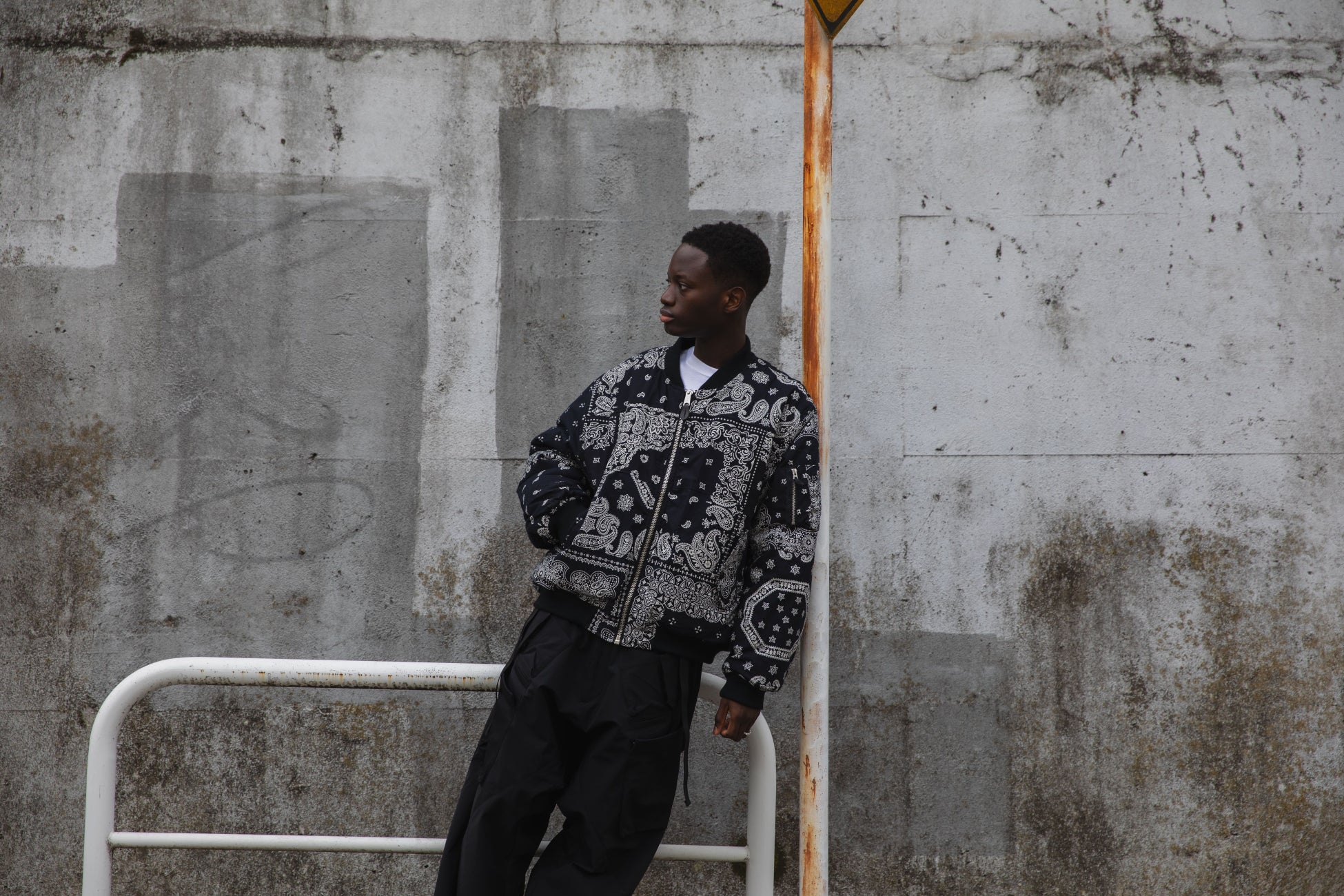 即完で話題のMIYAGIHIDETAKAのシグニチャーアイテムであるバンダナシャツと同様に、ボンバージャケットの中心が1枚のバンダナの形になるよう四角にパッチワークしていることが特徴。