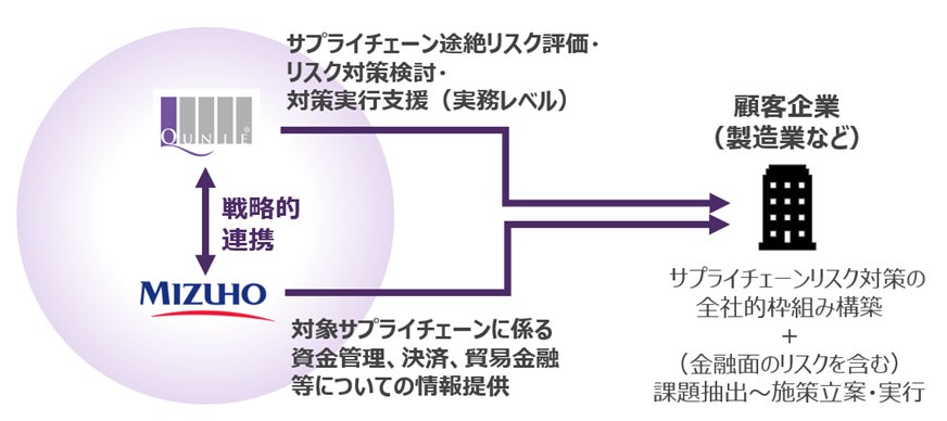 そこで今回、従来個別に行われてきたサプライチェーンマネジメントコンサルティング(※2)と銀行による支援を連動させることとし、クニエが製造・調達現場の経験を持つコンサルタントによる途絶リスク分析・対応支援を強化するのにあわせ、みずほ銀行が保有するグローバルな資金管理・貿易金融の知見を連動してお客様に提供する取り組みを実施します。