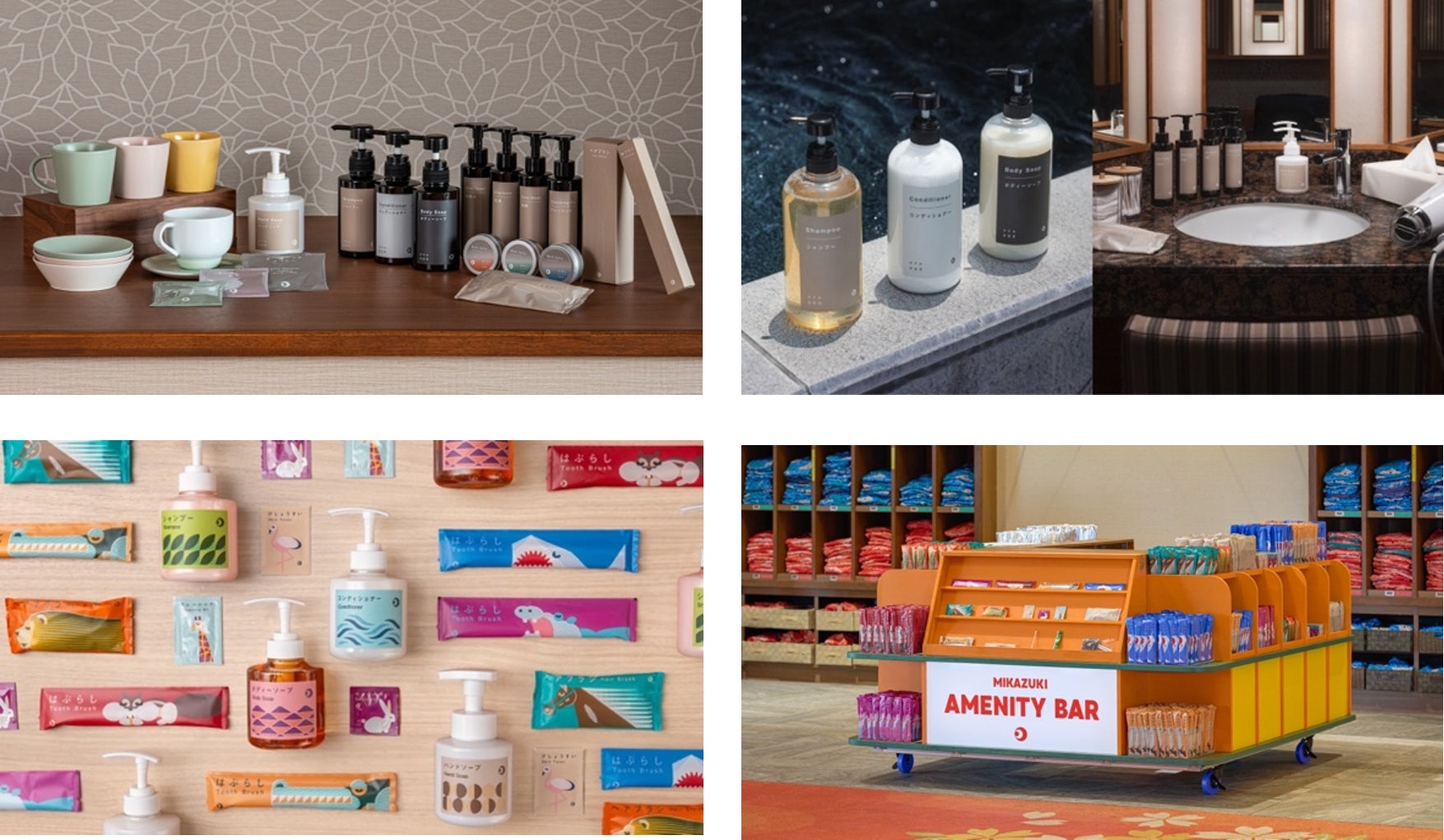 「富士見亭」では“資源循環型ホテル”を目指す「サステナブルリゾート化計画」の一環としてアメニティを全面的に見直し、オーガニックをテーマにしたサステナブル仕様へと刷新。上質なスパリゾートホテルとしてのブランドイメージへ転換を図るとともに、宿泊単価に見合ったハイクオリティなアメニティに一新しました。「龍宮亭」では“エンターテインメントホテル”と位置付け、親子で楽しめるデザインへのリニューアルを行うとともに、体験型のアメニティバーを新たに導入します。