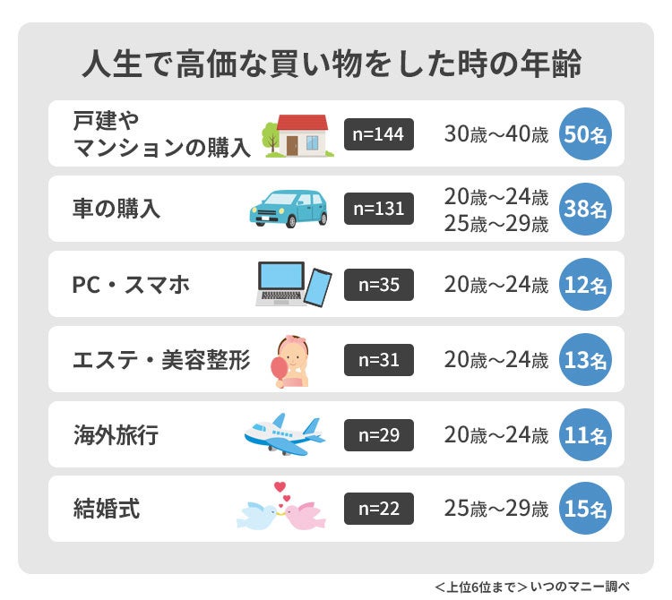 高価な買い物の上位6位までを年齢別に見てみると、下記の表のような結果になりました。