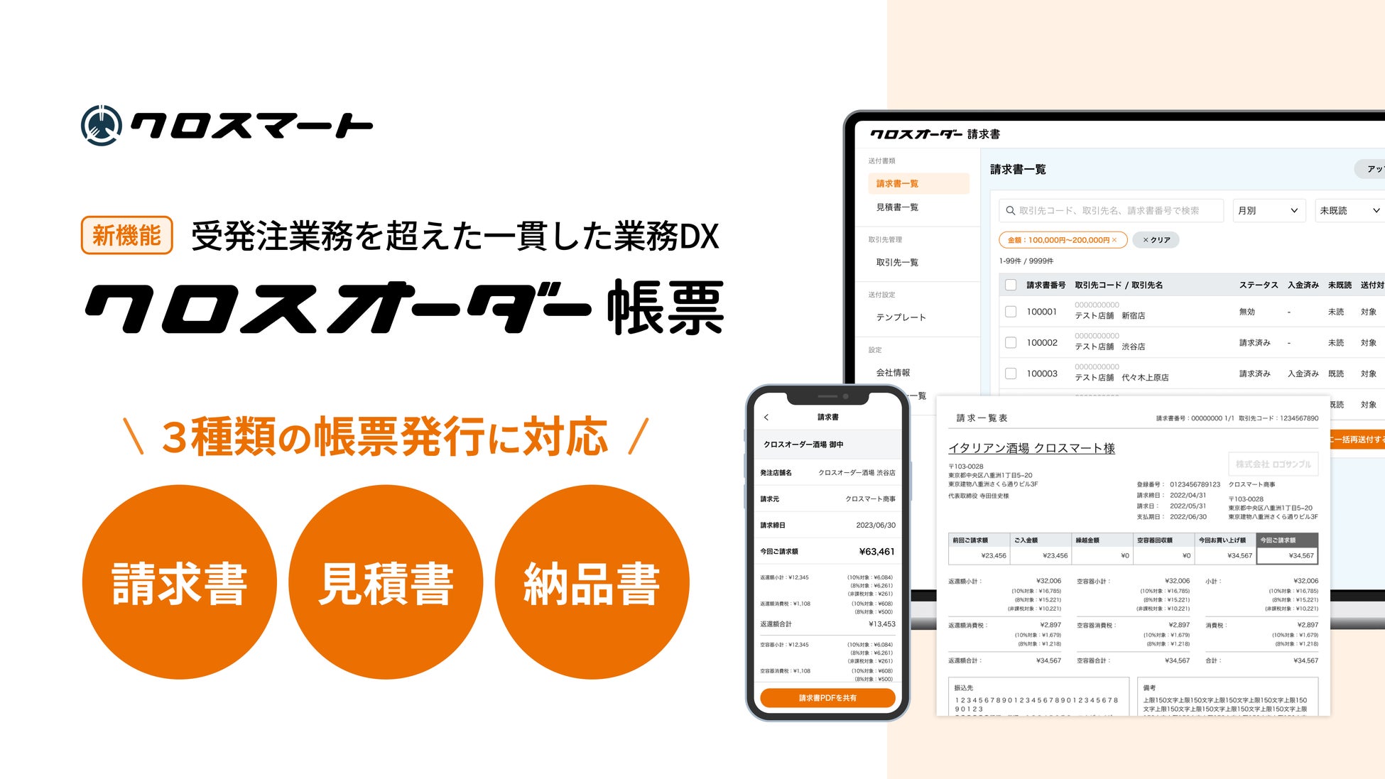 食品流通のDX(デジタルトランスフォーメーション)を推進するクロスマート株式会社(本社:東京都中央区、代表取締役:寺田 佳史、以下「当社」)は、これまで提供していた請求書発行サービス「クロスオーダー請求書」に加え、新たに見積書・納品書の発行機能を追加し、「クロスオーダー帳票」の機能を強化しました。これにより、食品卸売会社様と飲食店様の取引の流れをよりスムーズに管理し、効率化を促進します。