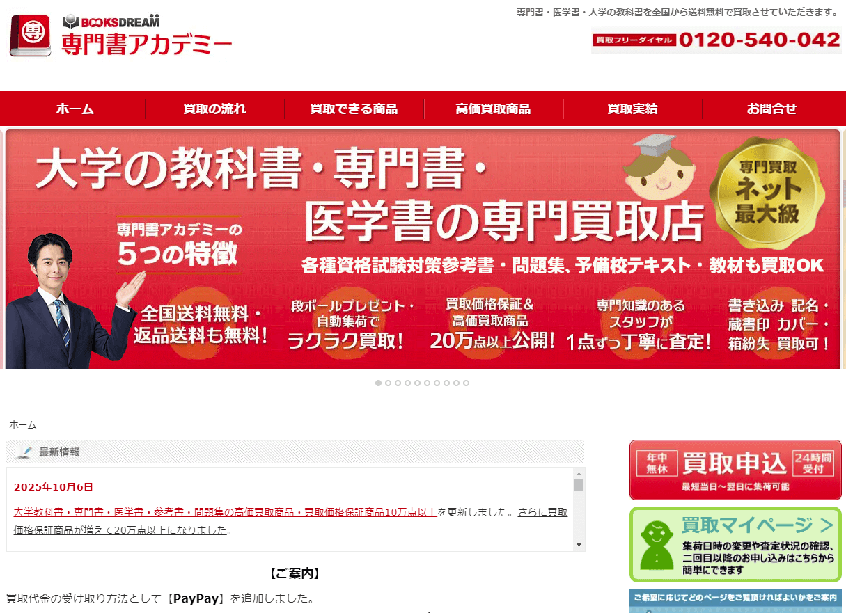 株式会社ブックスドリーム(本社:大阪府大阪市、代表取締役:井上聖也)は、同社が運営する大学教科書・専門書・医学書・資格試験参考書・問題集の専門買取サイト「専門書アカデミー」で公開している高価買取・買取価格保証商品を更新し、買取価格保証商品点数を大幅に追加し、20万点以上になりましたので、ご案内致します。