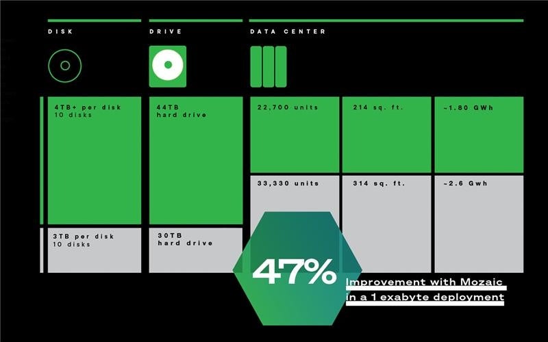 Mozaic 4+プラットフォームを使用すると、ディスク1台あたりの容量は大幅に増加します。インフラの設置面積やエネルギー消費量を増やすことなく拡張可能な、大容量でコスト効率の高いストレージを整備し、大規模AIを活用できるコスト基盤を強化できます。ラックあたりとワットあたりの容量を増やせるMozaic 4+によって、企業はデータセンターの効率性を高め、総所有コスト(TCO)を削減しながら、データを長期にわたって持続可能な形で保存し、再活用できるようになります。