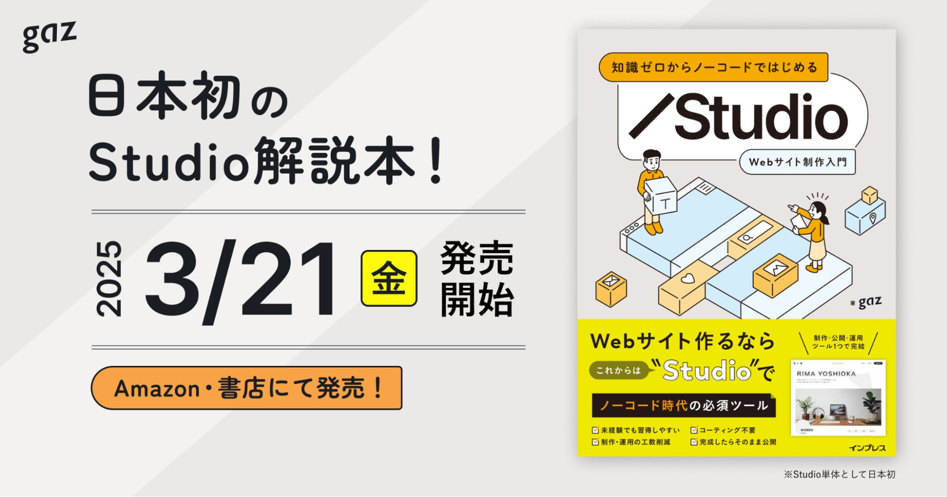 Studioを用いたサイト制作において400以上の制作実績をもつ、株式会社gaz(ギャズ)は初のStudio単体の解説本、『知識ゼロからノーコードではじめる Studio Webサイト制作入門』を2025年3月21日金曜に発売することをお知らせいたします。