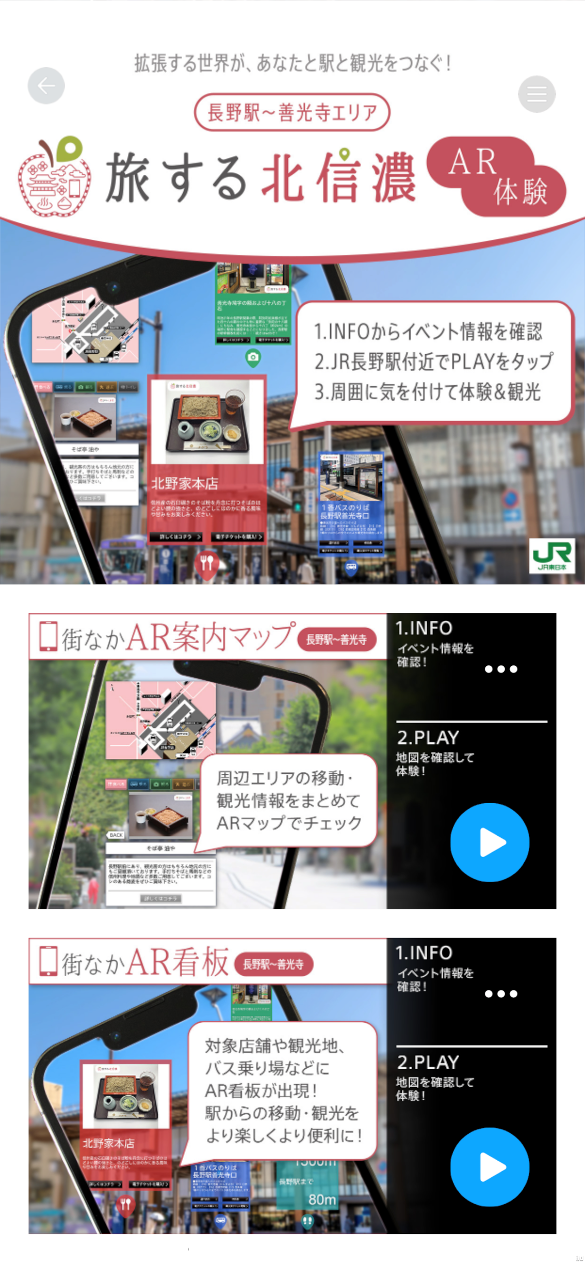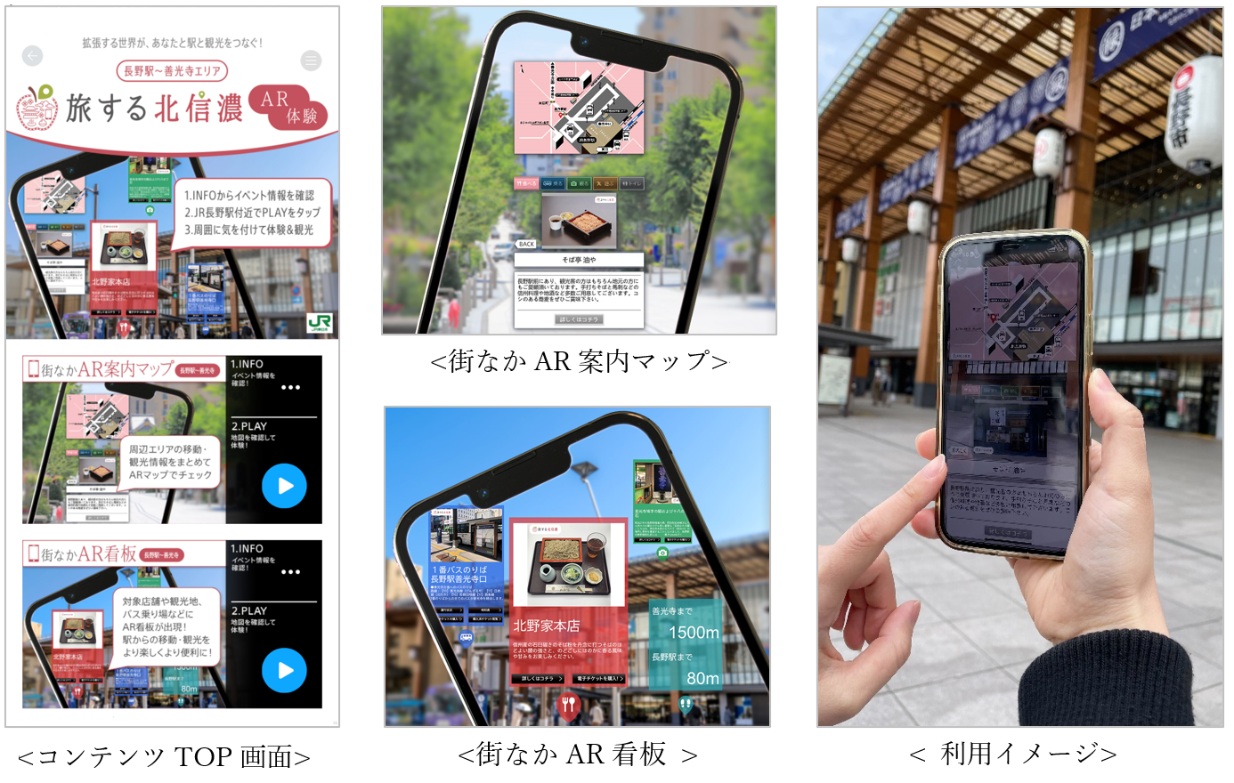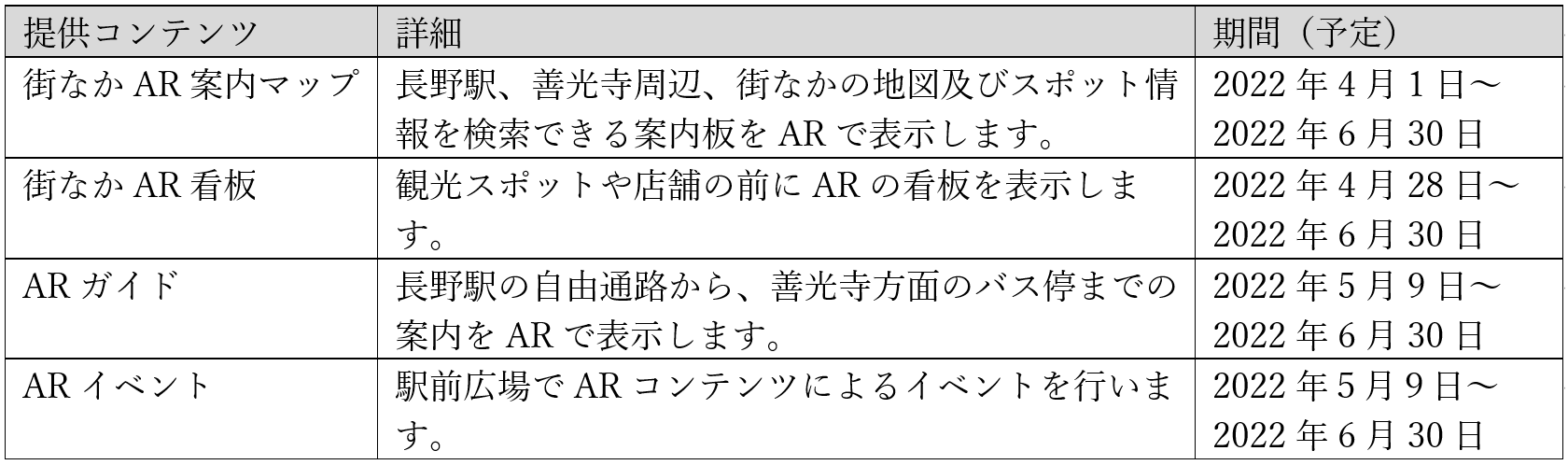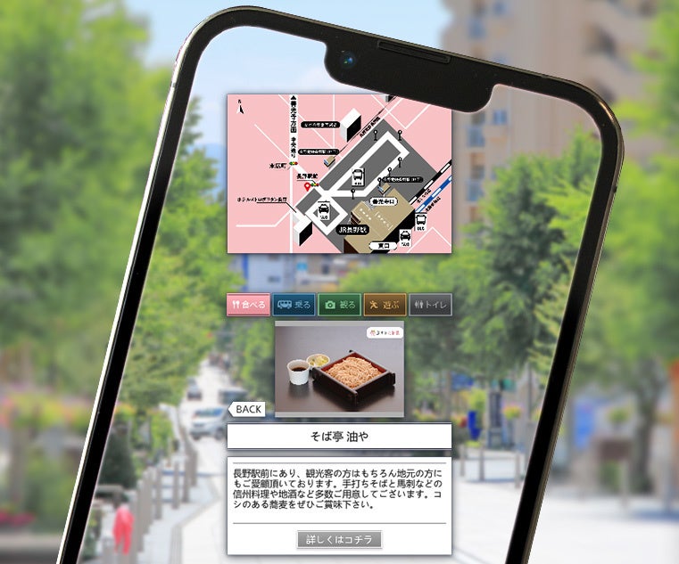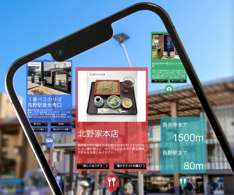 本イベントでは、長野駅から善光寺周辺の対象エリアにて「XR CHANNEL」でスマートフォンをかざすことにより、観光スポットや対象店舗の情報がお客さまのスマホ画面にARとして表示されます。