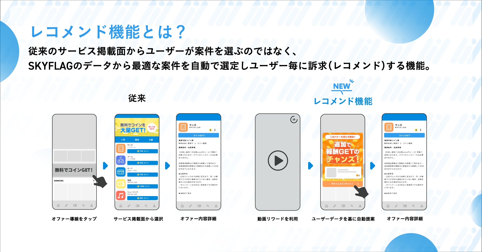 この度リリースした「レコメンド機能」では、動画リワード広告視聴後等の任意のタイミングで、データに基づきユーザー毎に最適なオファー(広告)を『SKYFLAG』が自動選択しユーザーに対して表示することで、ユーザーの挑戦機会をこれまでよりも多く創出し、企業様の更なるマネタイズをサポートします。