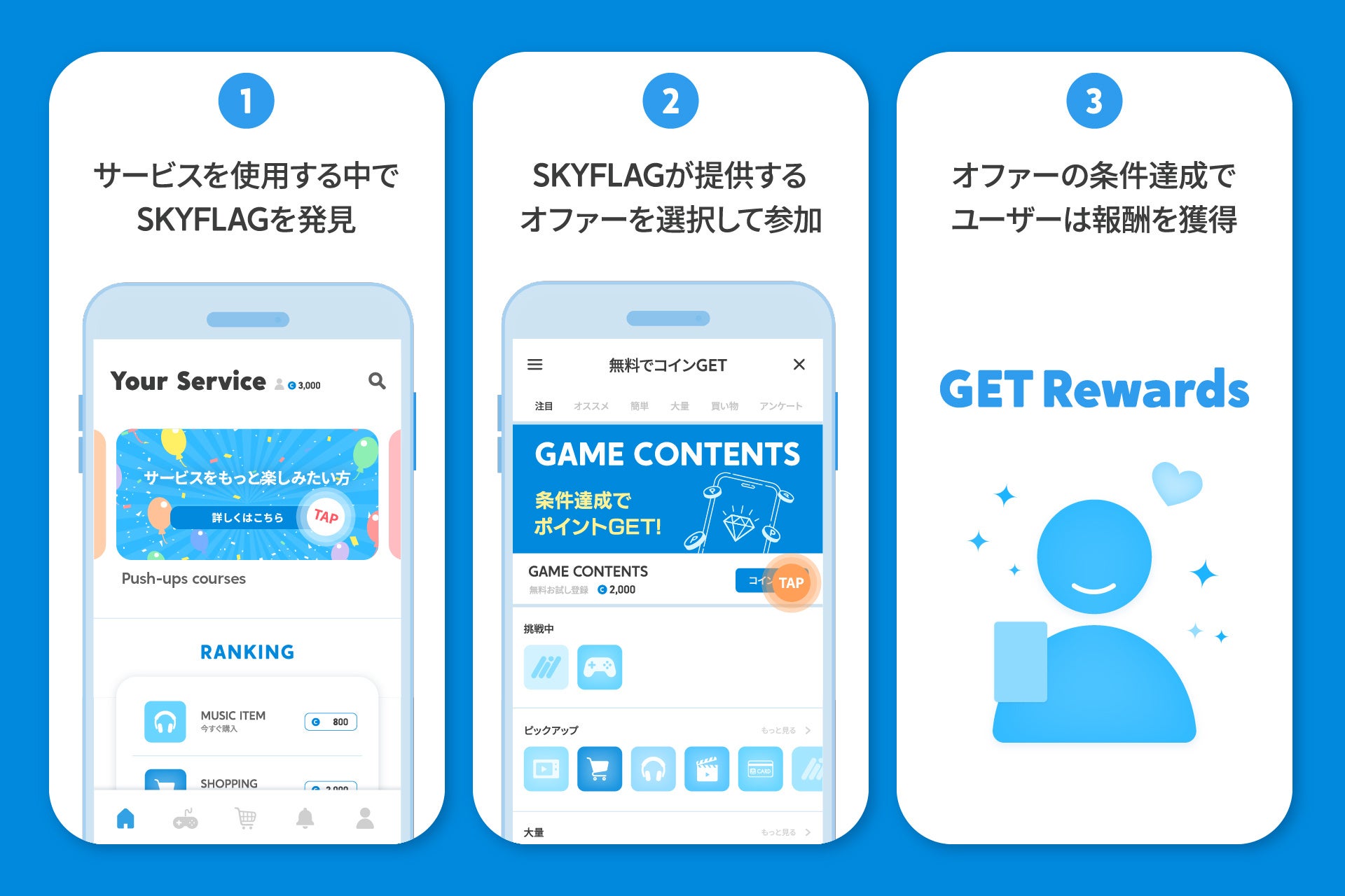株式会社Skyfall(本社:東京都港区、代表取締役社長:長谷川 智一、以下Skyfall)は、当社の運営する広告マネタイズプラットフォーム『SKYFLAG』において、動画リワード広告視聴後等の任意のタイミングで、最適なオファー(広告)をユーザーに表示する「レコメンド機能」をリリースしました。ユーザーは、『SKYFLAG』を通してオファー(広告)に挑戦することで、サービス内で課金体験と同等の体験を得ることができます。この度『SKYFLAG』にて新たに「レコメンド機能」を提供することで、導入企業様の更なるマネタイズに貢献し、ユーザーに対する“新たな選択肢”の提供を加速させます。