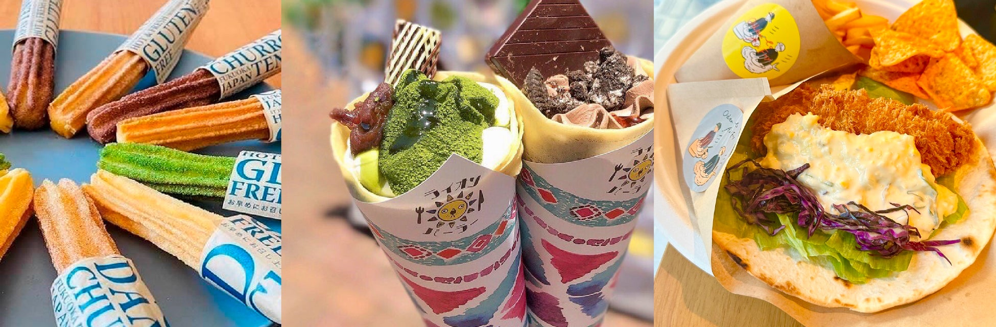 ポテトやチュロスなど人気の持ち歩きフードはもちろん丼もの・お肉などがっつりメニュー等も販売!