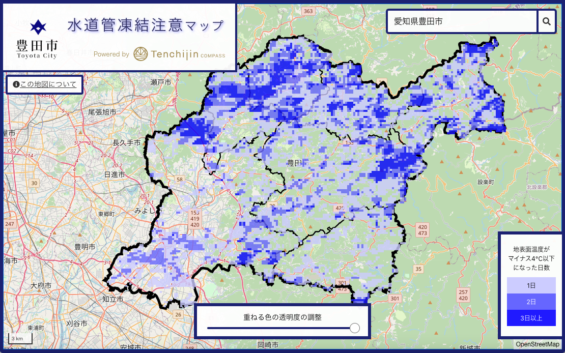豊田市水道管凍結注意マップは、このシステム開発で使用している地表面温度のデータを活用し、地表面温度が-4℃以下になった日数に応じて、水道管の凍結注意度を3段階で表示しています。
