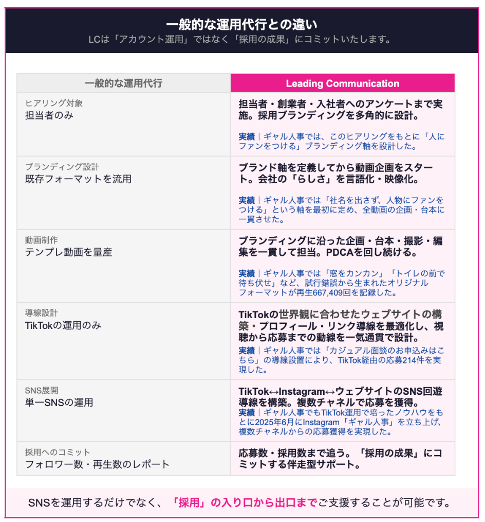 TikTok・Instagramそれぞれの特性を理解し、求職者の行動導線を設計できる。これは、SNSマーケティングを深く知るLeading Communicationだからこそ実現できた戦略といえるでしょう。