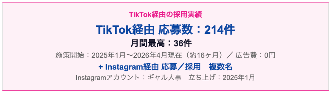 立ち上げから約16ヶ月。広告費ゼロで、以下の成果を達成しました。TikTokだけでなく、運用の中でInstagramアカウントも立ち上げ、SNSをまたいだ応募獲得の仕組みが機能し始めています。