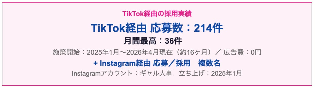 株式会社Leading Communication(本社:東京都渋谷区、SNSマーケティング事業部)は、自社運営の採用特化TikTokアカウント「ギャル人事はバズらせたい(@gal_jinji)」において、TikTok経由の応募214件・月間最高36件を達成し、採用コスト30%削減を実現したことをお知らせします。