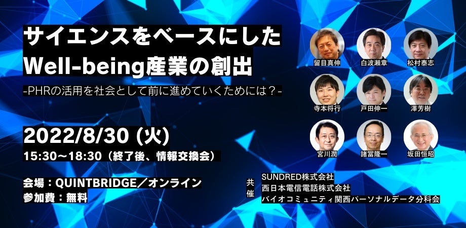 SUNDRED、NTT西日本、BiocKパーソナルデータ分科会 共催セミナー「サイエンスをベースにしたWell-being産業の創出 - PHRの活用を社会として前に進めていくためには?-」を開催決定