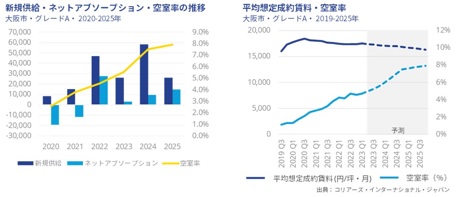 2023年1~3月期の大阪市中心部では、新規供給量と同等のネットアブソープション※2(需要)が記録されたため、空室率は横ばいを維持し、賃料水準の緩やかな上昇に寄与しました。ただし、2023年通年では、新規供給量が前年から大きく増加する一方で、需要が伸び悩む傾向にあるため、空室率は上昇傾向を続け、賃料は下落することが予想されます。